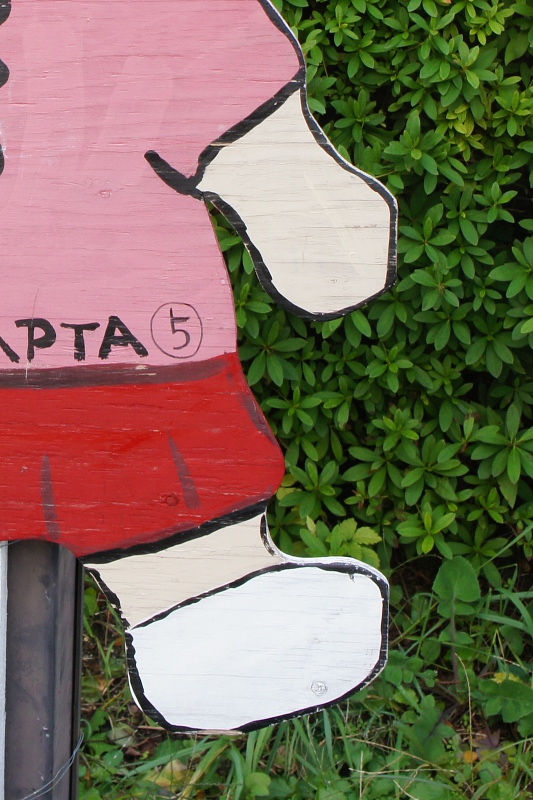 一見すると「お遣いの女の子」です。しかし飛び出し注意の看板に描かれているのは基本的に子供であるという先入観を捨てると、この女性はちょっと子供っぽい服を着た主婦であるという可能性も捨て切れません。そう、たまには主婦だって飛び出すかもしれませんもの。