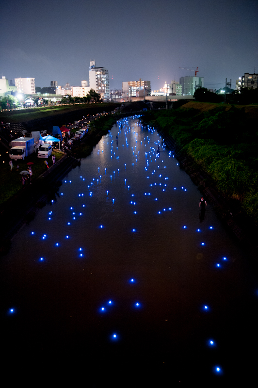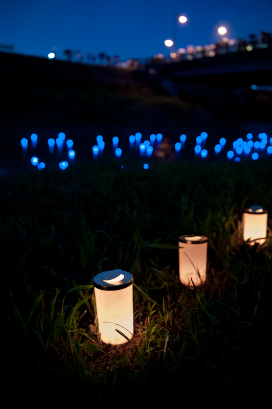 写真右の青い光が「ひらかた七夕ゆめのほしプロジェクト」による「いのり星®」の放流で、左の「2013七夕」という文字が作られてるのが「七夕灯路」です。