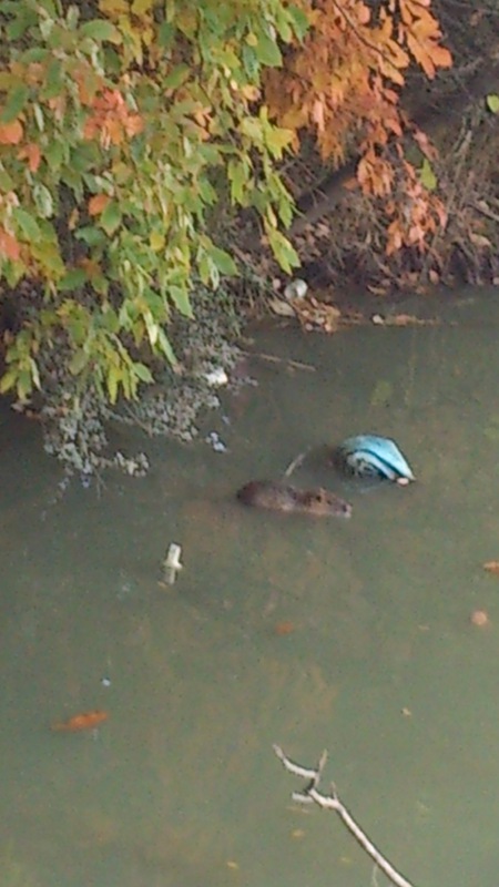 こいつはヌートリアですね!以前「弟子えもん」さんからもご投稿いただいたことがあります。他にも禁野の用水路(今は工事しててもういませんが)や山田池公園などにもいるそうです。詳しくはWikipediaで。