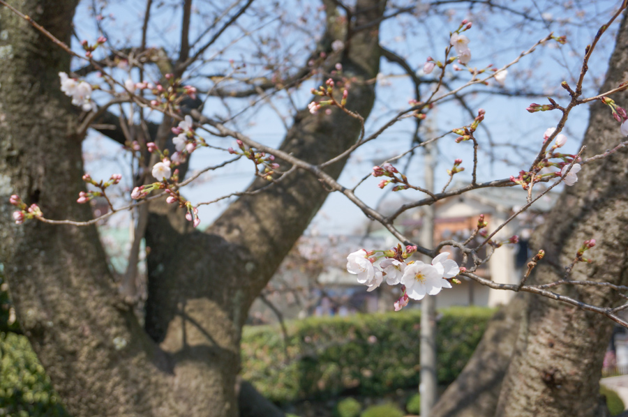 高台になってる公園を囲んで10本ほどの桜の木があります。一部の木が咲き始めたぐらいの段階でした。