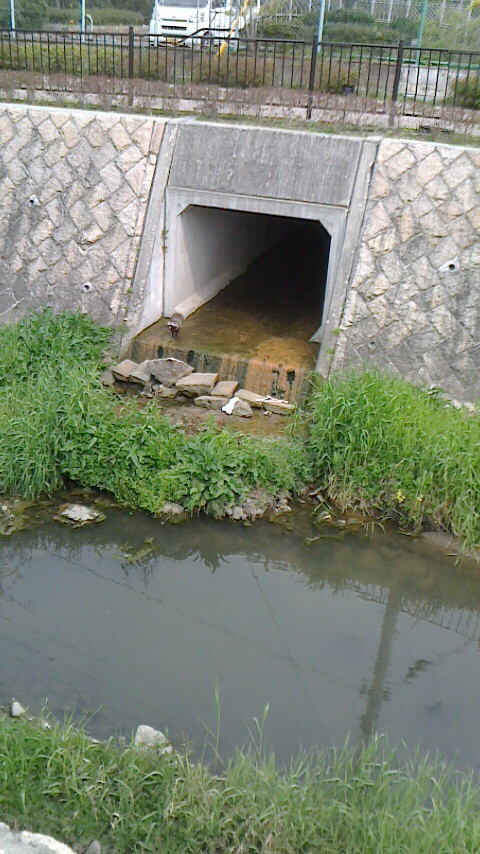 犬の散歩中、伊加賀西町の淀川衛生工場正門前の水路の横穴出口付近で見慣れない生物を発見しました。