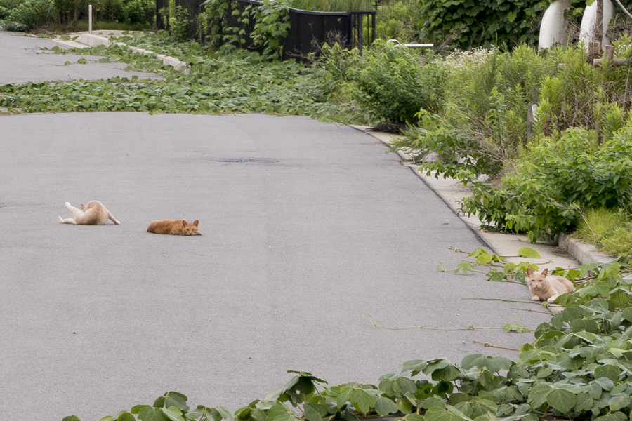 人間が入ってこないところは猫たちにとっては無敵ゾーンで気が休まる場所なんでしょうね。右の2匹はこちらに気がついてちょっと警戒してますが、左のヤツはもし何かあったら逃げ遅れるタイプっぽいです(笑)
