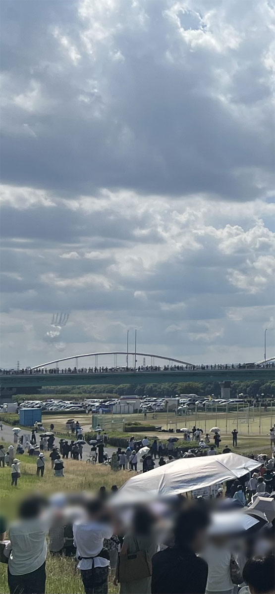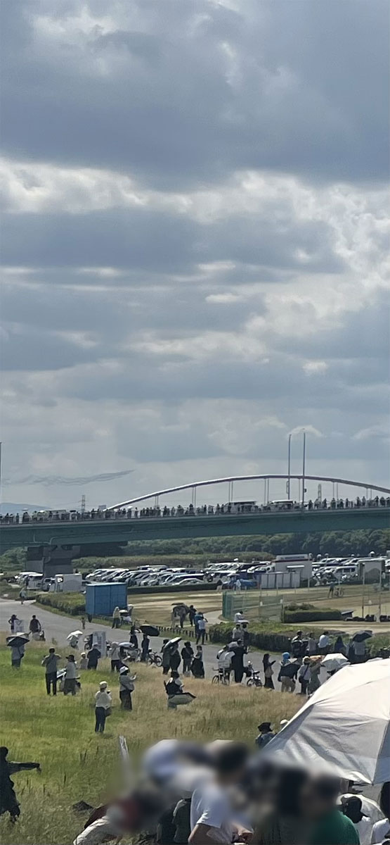 近くの天野川の堤防にブルーインパルス目的の人達が集まっています。