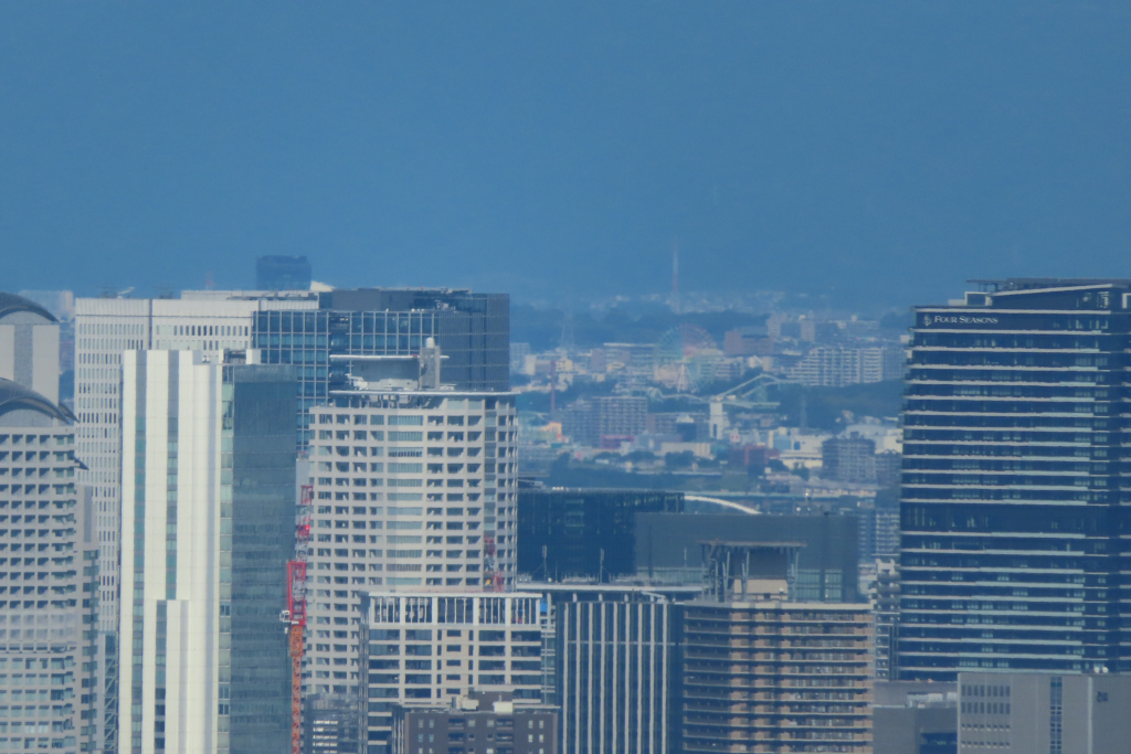位置的には、遠景写真の中央から少し左側に「asue大阪プールのドーム」とその真上辺りにある「赤青白枠のある関電ビル」から二つ左のビルが、「フォーシーズンズホテル大阪」となり。