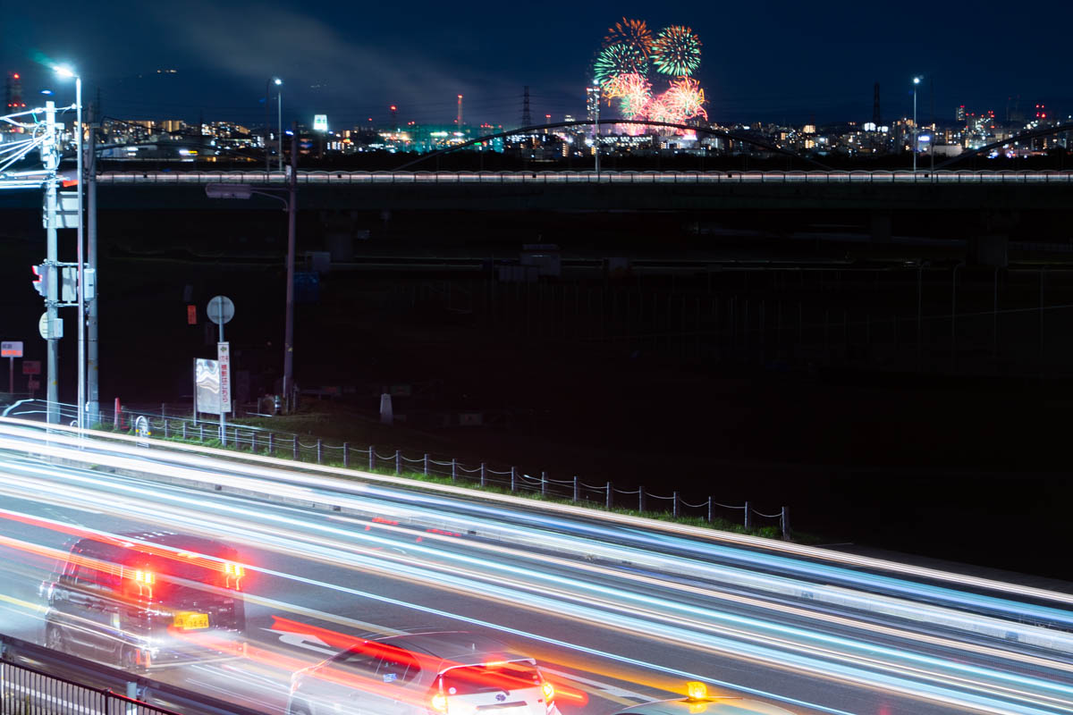 実はここより少し花火寄りの高槻でも花火を撮ってきたんですが、ちょっと移動しただけでだいぶ花火の大きさは変わるんだなぁ〜と思いました、つまりは次に万博記念公園の花火を見る時は、枚方大橋を越えるのがオススメですよ!