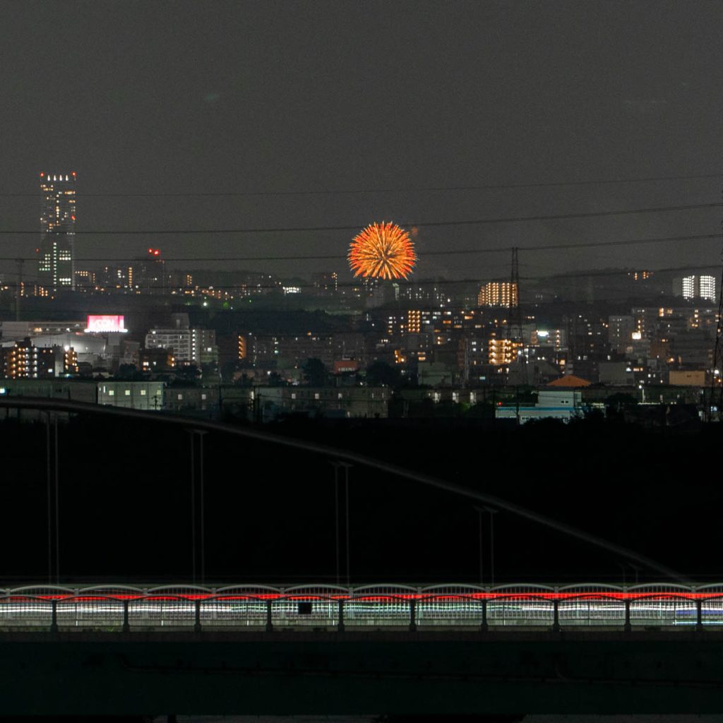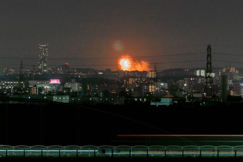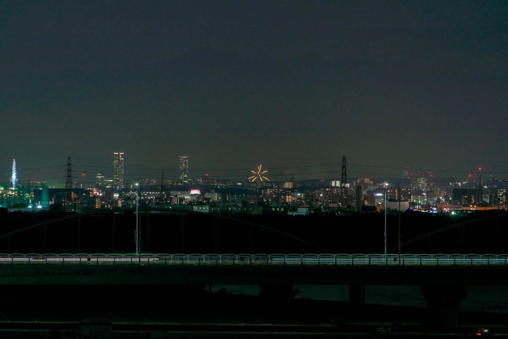 枚方公園駅近くの鍵屋別館から「第75回 猪名川花火大会」の花火が見えています。