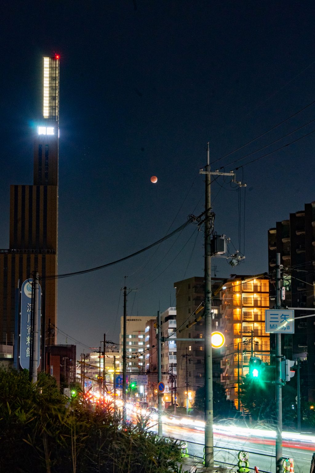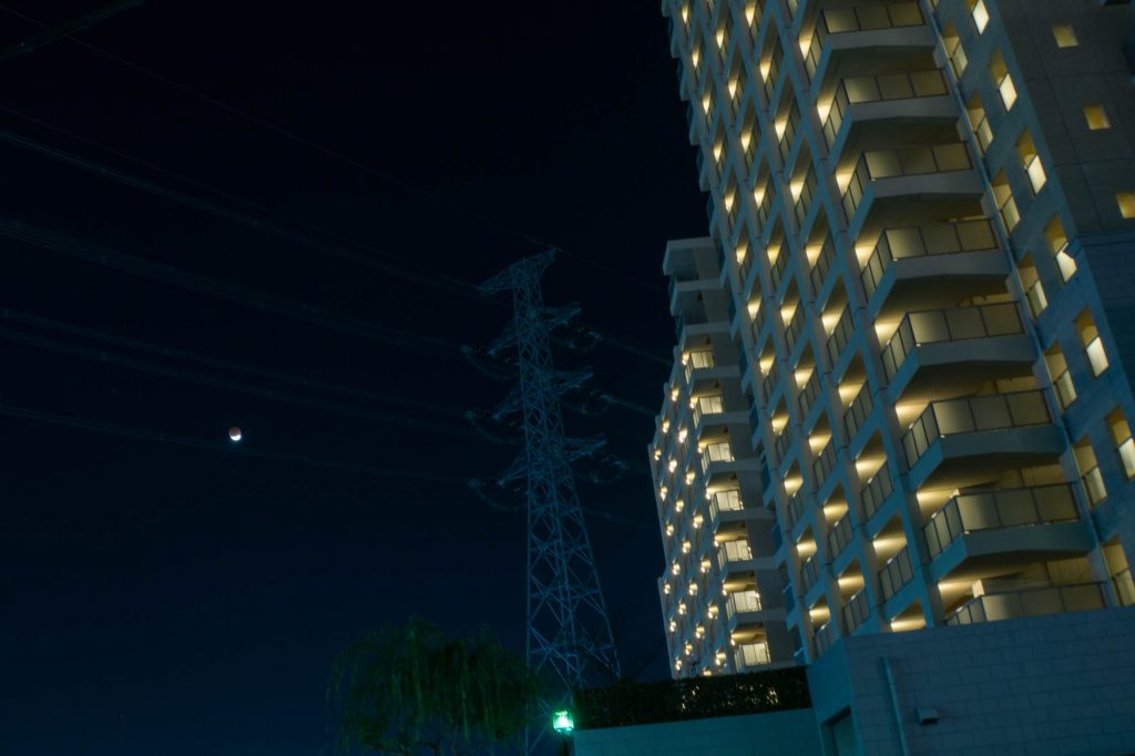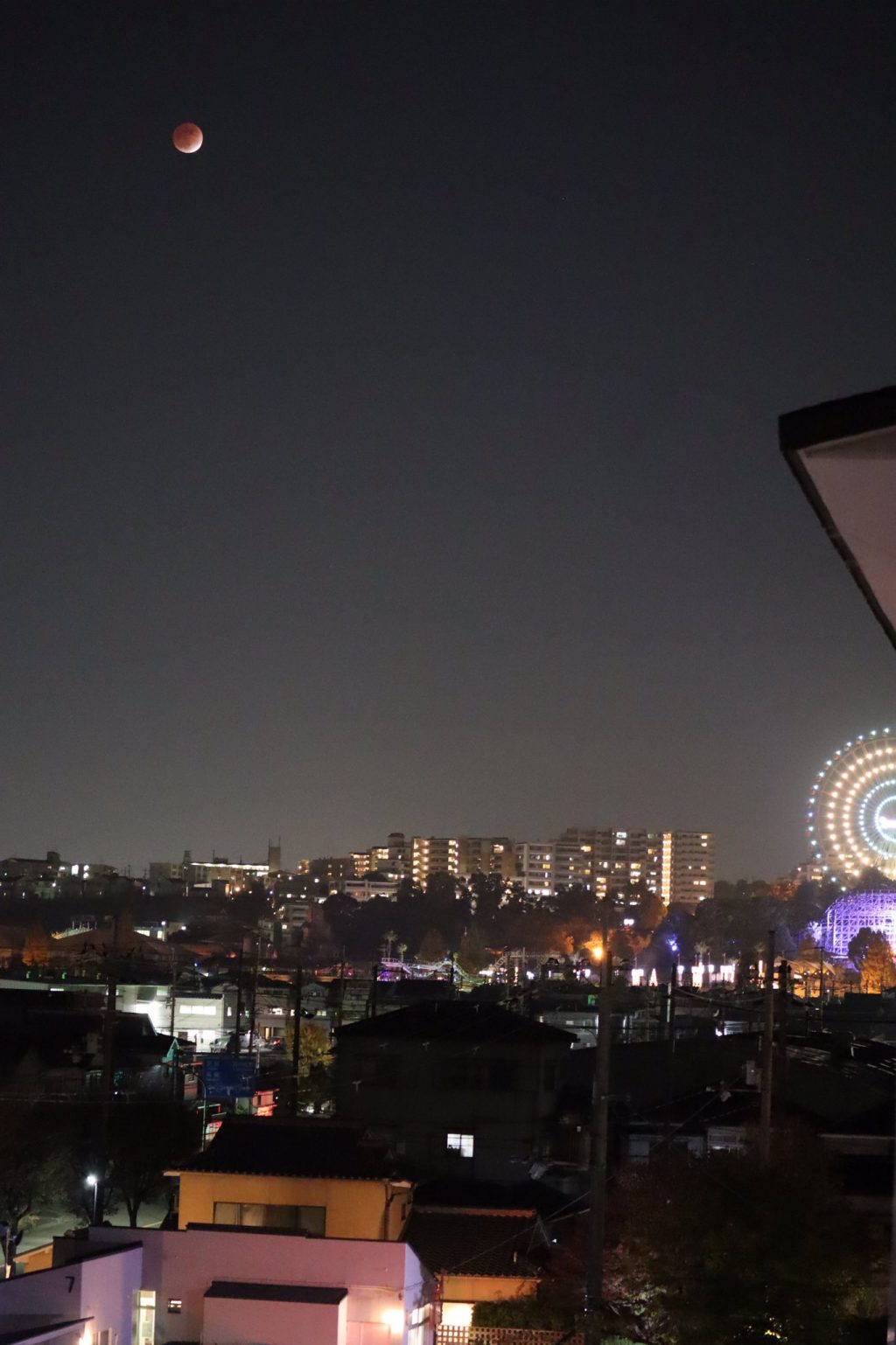 自宅から撮りました。月食と、かろうじてひらパーの観覧車とのコラボ!