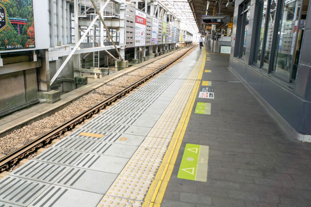「お」っぽく見える床のタイルは僕ガーサンがパッと調べた限り、「1番線(出町柳方面)」のみ。