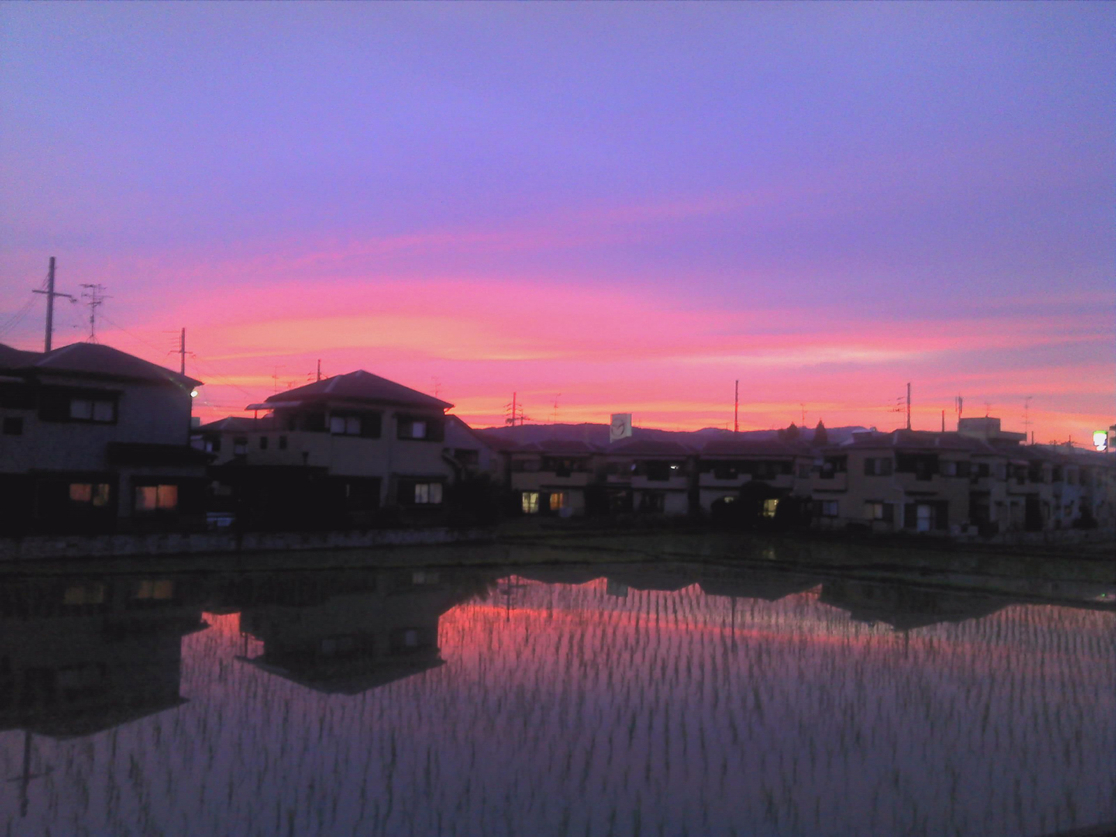 コメント オレンジではなく、ピンクと紫に染まる夕日が、家のそばの田んぼに映って綺麗でした。