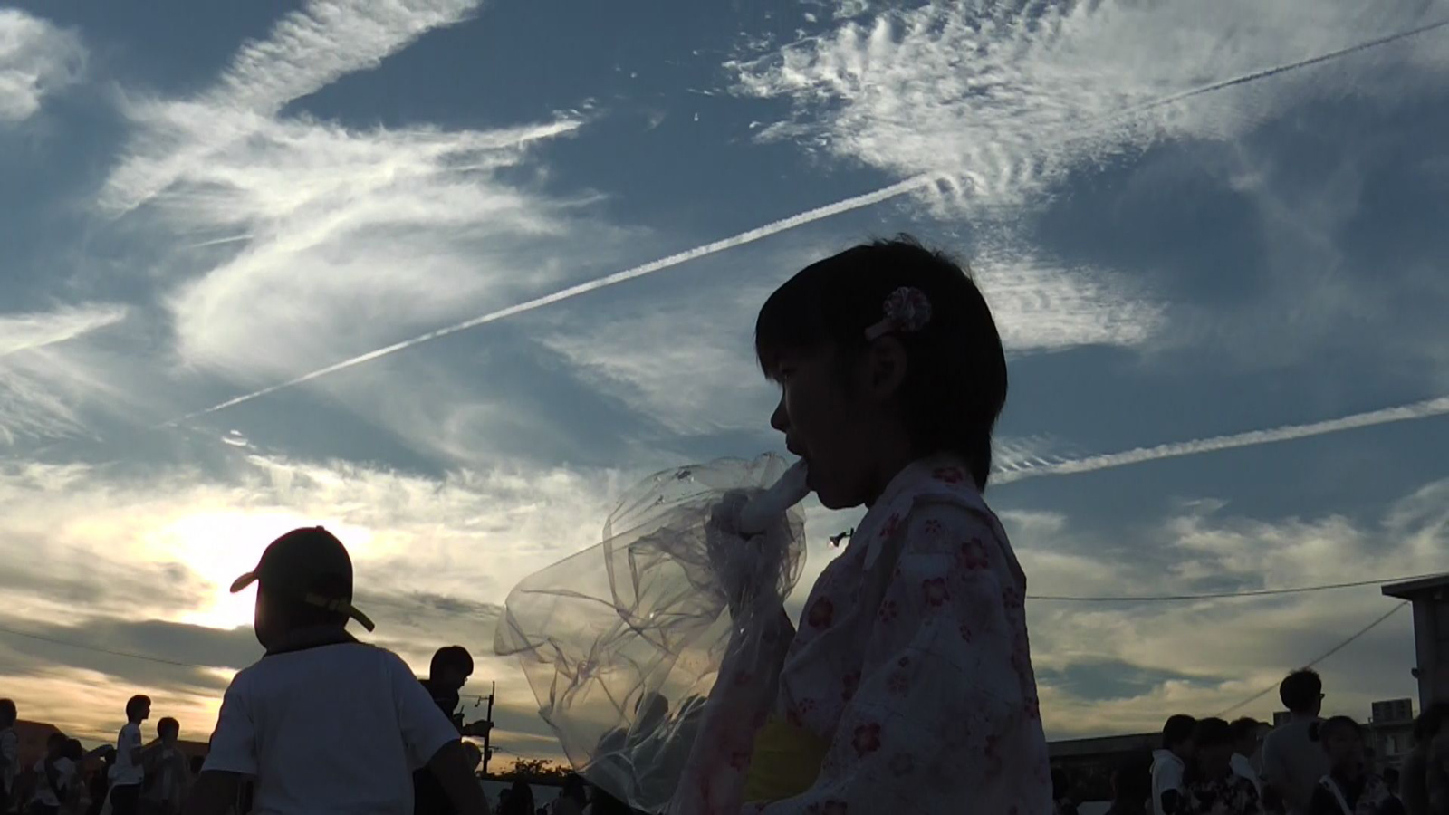 校庭での雑踏とは裏腹に、飛行機雲や、色んな形の雲が、少しずつ暗くなって行く空に、白く映えて綺麗でした。