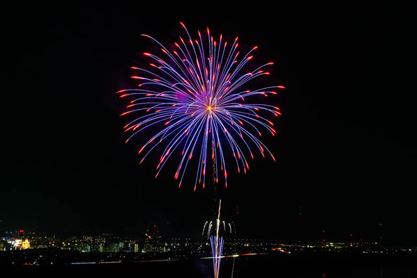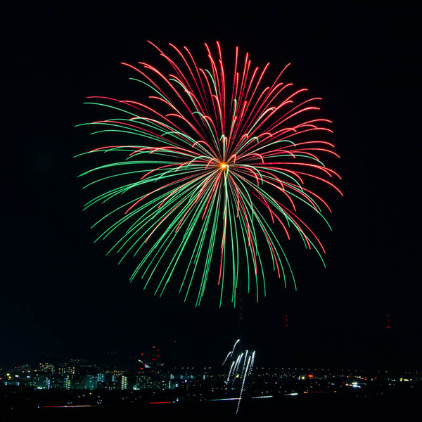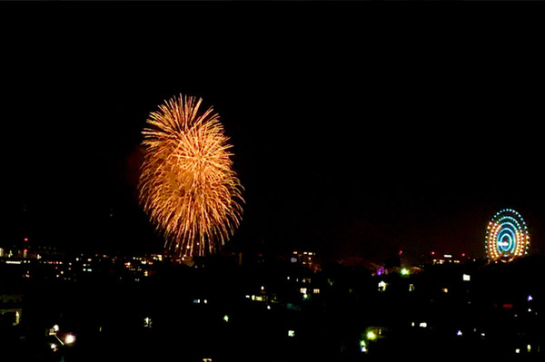 自宅から花火がたまたま見えたので、急いでカメラを準備して撮影しました。