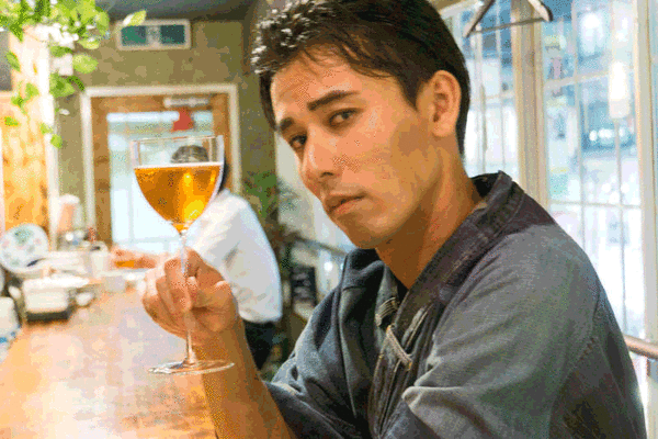 意味深な目でビールを見つめる枚・かた男。口説いてきそうな雰囲気です。