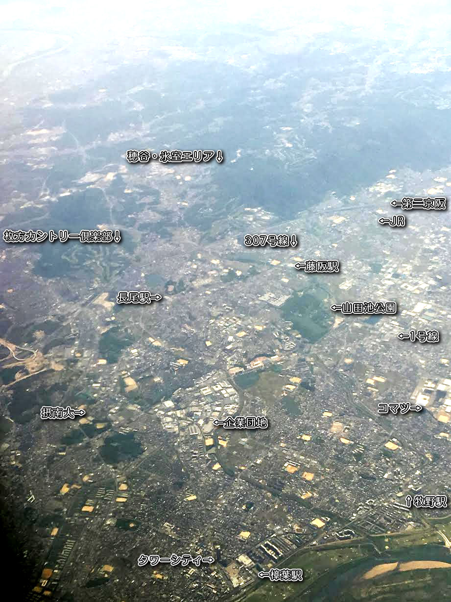 羽田行きの飛行機内から撮った枚方市【枚方フォト】 投稿日 2016年5月17日 15:00 著者 すどん カテゴリー フォト 今回の枚方フォトは「エスプレッソ」さんからのご投稿です! ◇お名前 エスプレッソさん(→これまでの投稿)◇撮影場所上空◇撮影日2016年5月2日◇使用カメラiPhone 6s◇コメント神戸空港発、羽田空港行の飛行機(スカイマーク)から枚方の街が見えました。 エスプレッソさん、ご投稿ありがとうございました! 枚方フォト投稿はこちら 【おまけ】加工して解説をいれました↓(クリックで拡大) 航空写真、素敵ですねー!これまでの航空写真はコチラをどうぞ。 シェア ツイート LINE エスプレッソ くずはエリア 枚方市駅・枚方公園駅エリア 津田エリア 牧野エリア 穂谷・氷室エリア 航空写真 藤阪エリア 長尾エリア