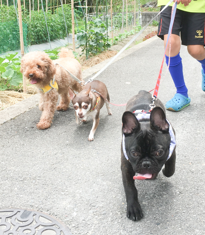 1週間前にお散歩デビューしたところですが、もも(チワワ)ピース(トイプードル)と並んで上手く歩けるようになりました。