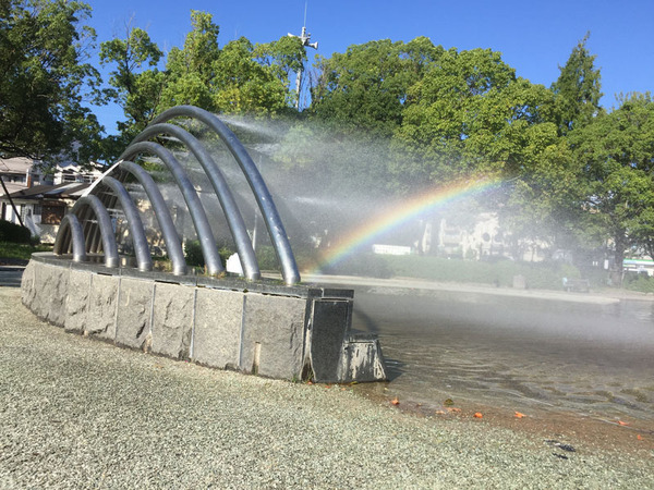 子どもを連れて遊びに行ったら、噴水の水に太陽の光が当たって虹が出来てました。