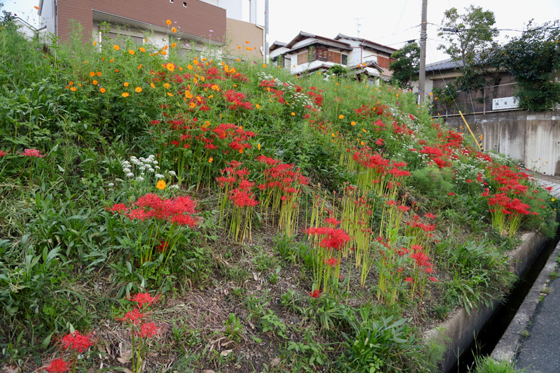 楠葉面取町の極楽寺(樟葉南小裏手)横の土手がすてきな花園になっていました。