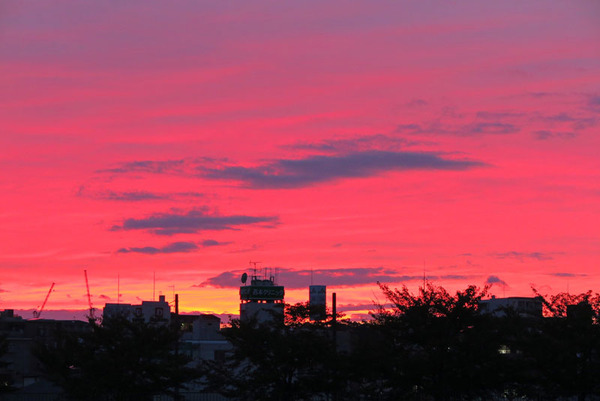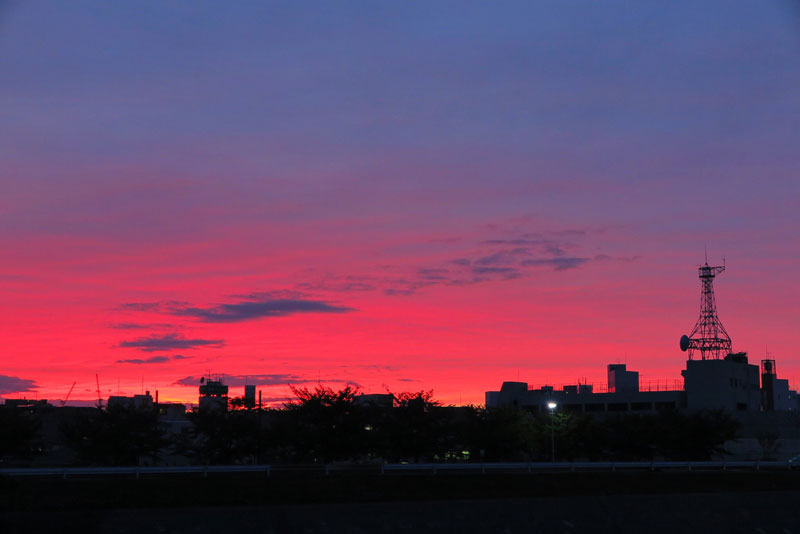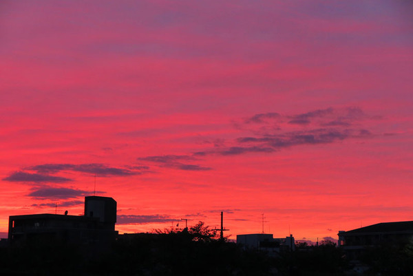 最近スッキリしない天気が続いて、キレイな夕陽がなかなか見れないと思っていたところ、急に空が赤くなってきたので急いで外に出てみると日没後の空が真っ赤に染まっていました。