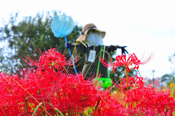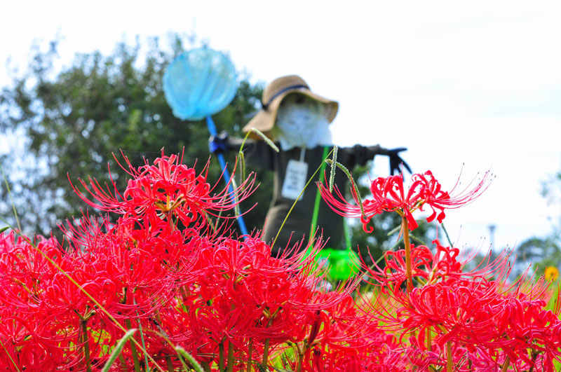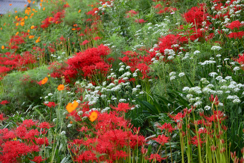 真っ赤な彼岸花と白いニラの花、そしてキバナコスモスが満開となっています。