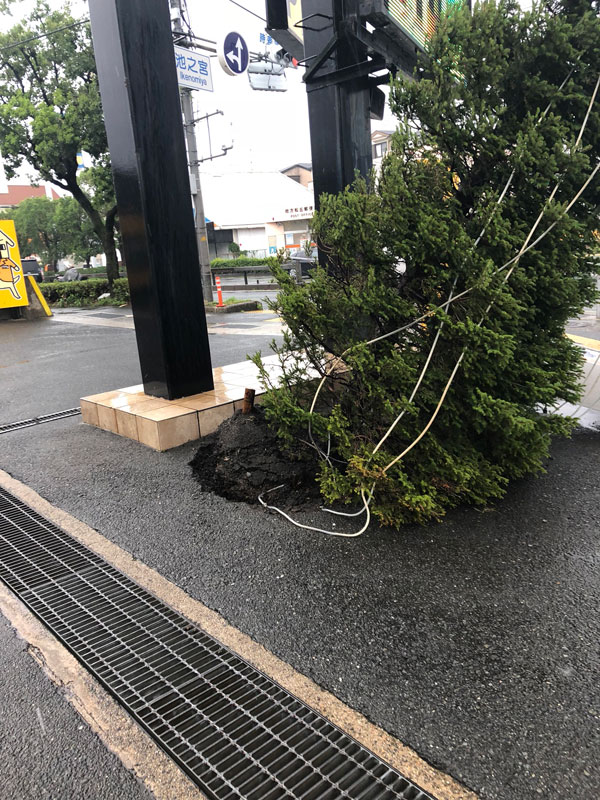 被害:街路樹が根本から折れて、歩道(コストコ側)をふさぐ形に倒れてしまっていた。