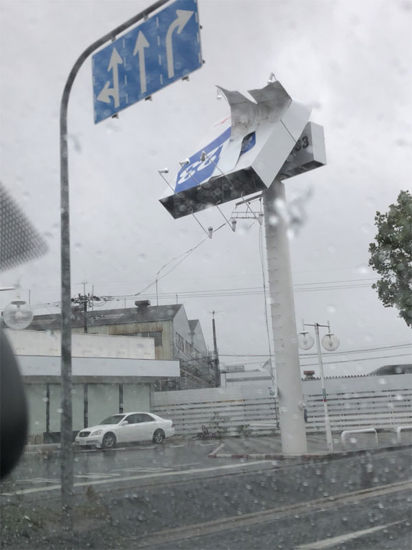 台風の風が少し収まったので少し家の近所を見回っていたらこの有様で道路に看板の破片が散乱してました