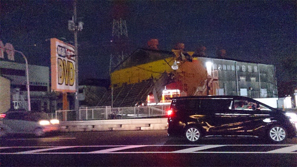 国道1号線沿い、マクドナルド近くの買い取りMAXの屋根(ひさし?)が壊れてました。
