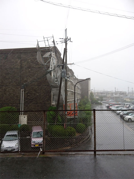 何が飛んで来たのかは定かではありませんが、多分付近の工事事務所の簡易型の壁かと思います。