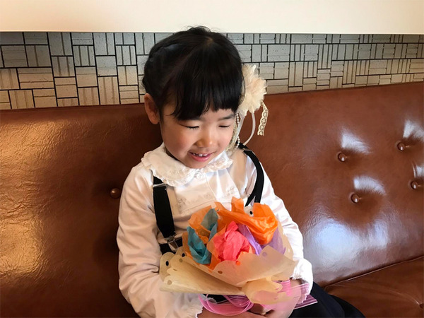 (3枚目)泣き虫だった長女が保育園を卒園する朝、在園児の子たちがくれた手作りの紙のブーケを持って。