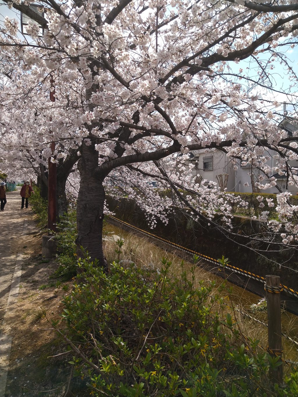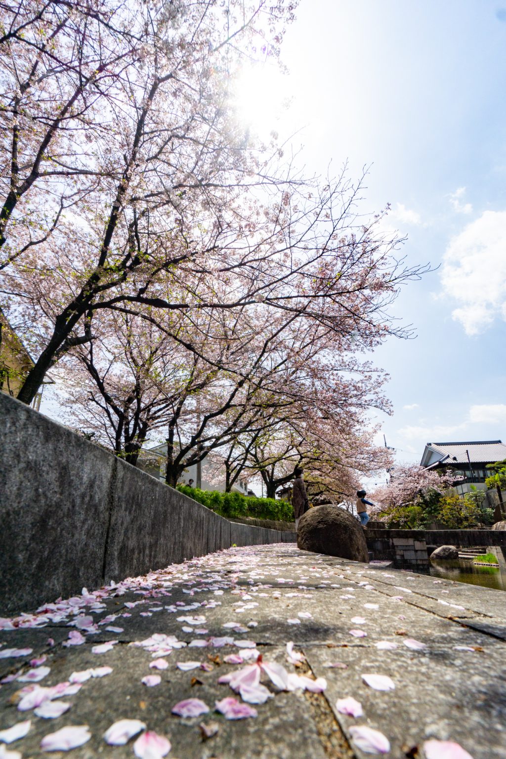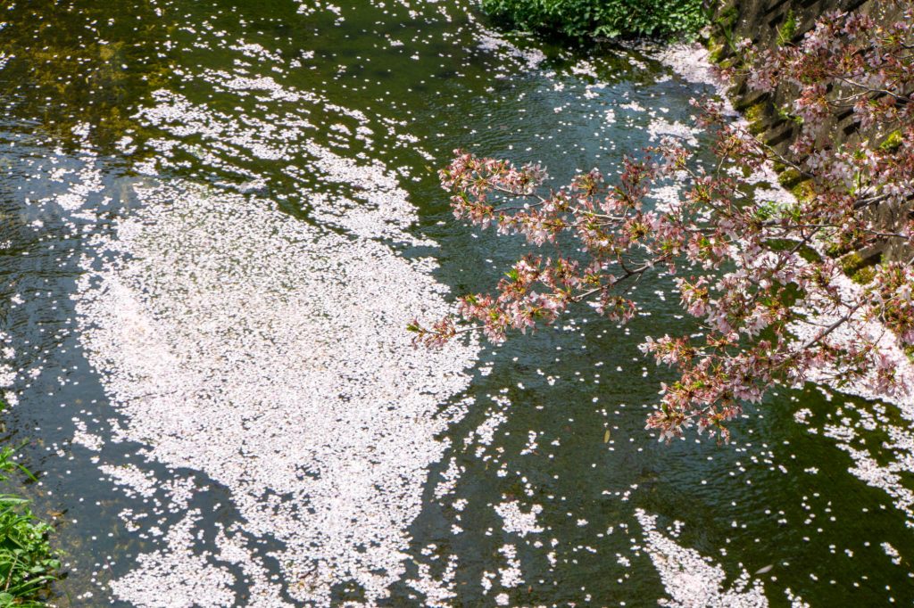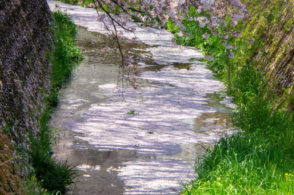 きっと散った桜の花が絨毯みたいに水路を流れているに違いない、そう思っていったら水路には流れてなかったです。地面にはたくさん桜がありましたし、花見をしている人、写真を撮りに来ている人もチラホラ。