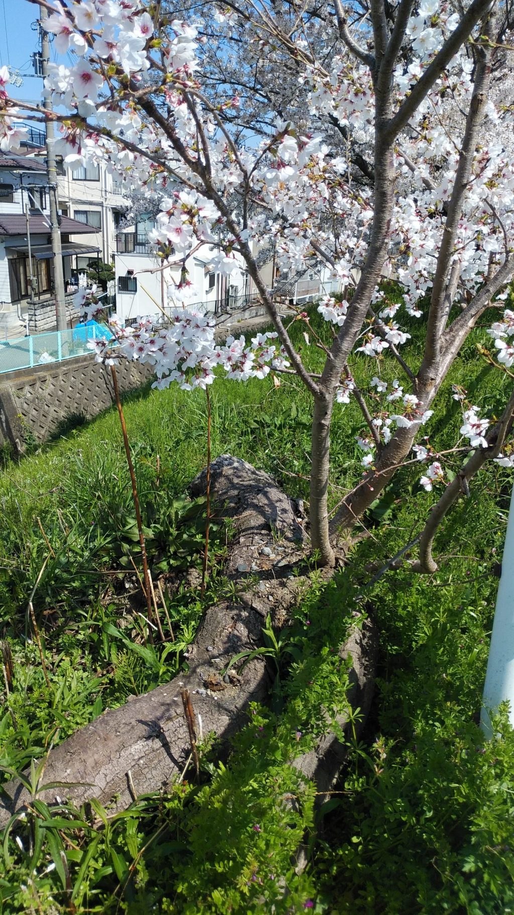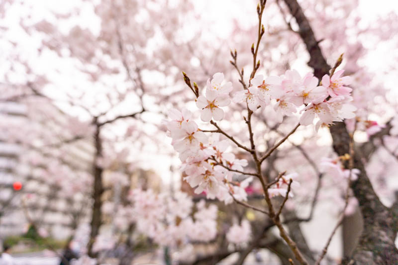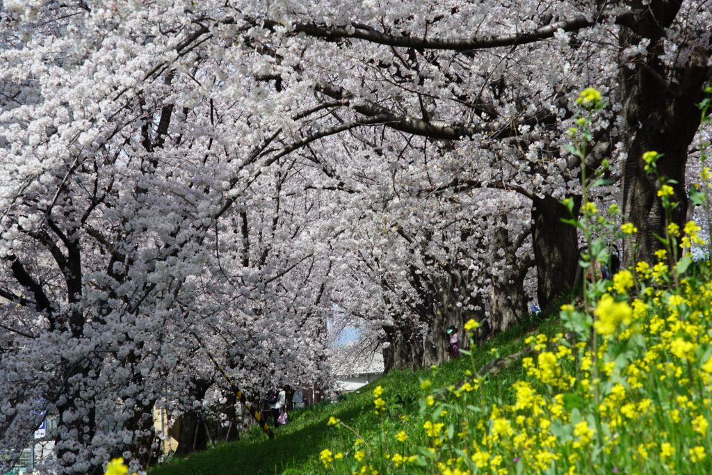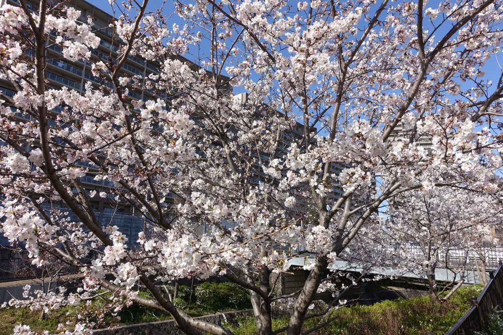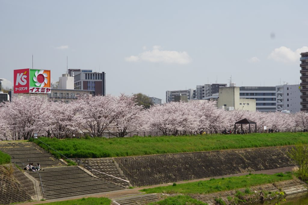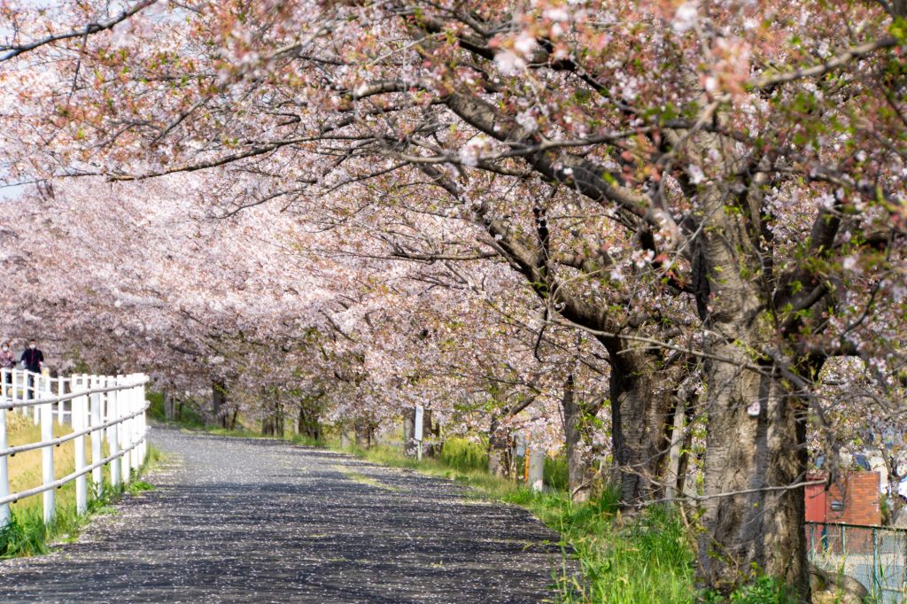 きっと散った桜の花が絨毯みたいに水路を流れているに違いない、そう思っていったら水路には流れてなかったです。地面にはたくさん桜がありましたし、花見をしている人、写真を撮りに来ている人もチラホラ。
