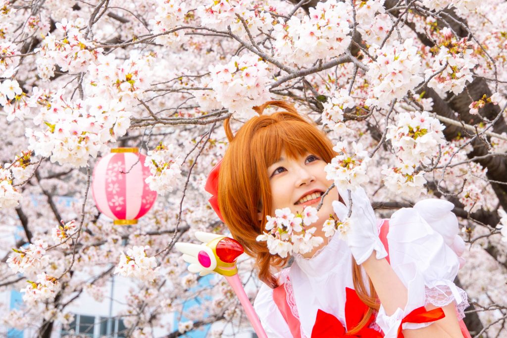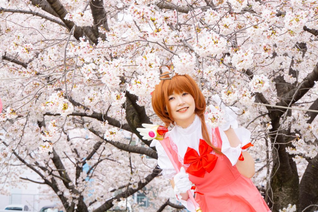 カードキャプターさくらのコスプレをしたお枚の方(さくらこ)さんと桜。