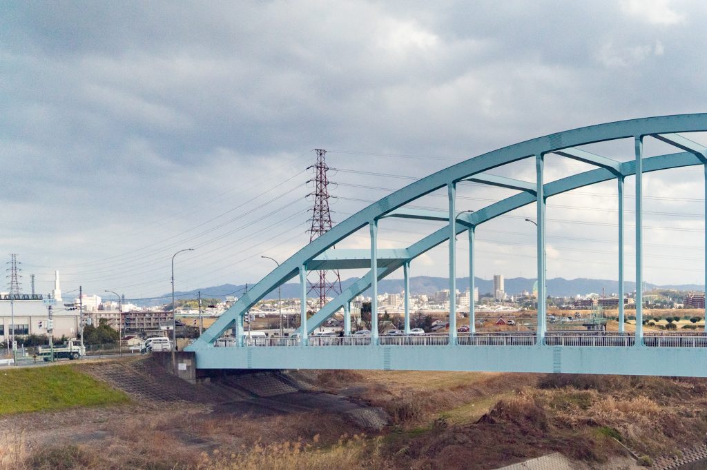 最後は枚方大橋を渡ったあとにすぐ左折した先にある水色の橋、鷺打橋と、めっちゃかぶってるひらパーの観覧車など。左の方にみえる塔は関西医大タワーです。
