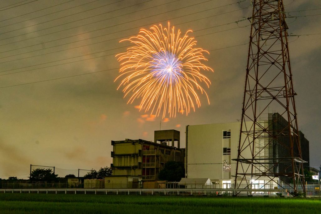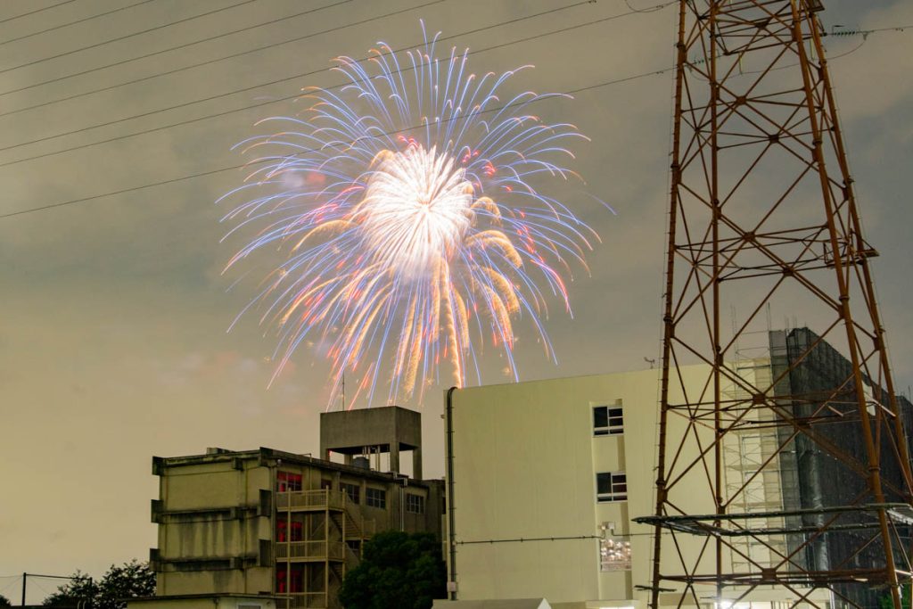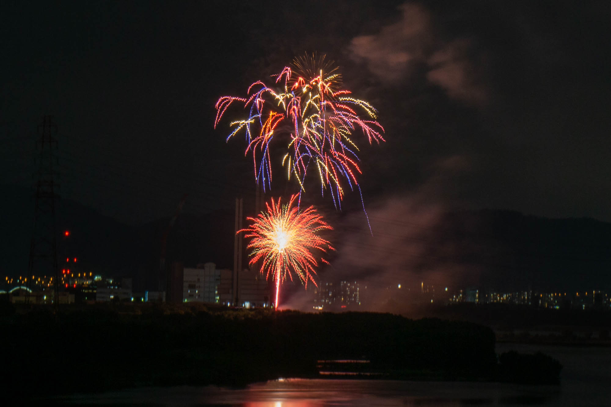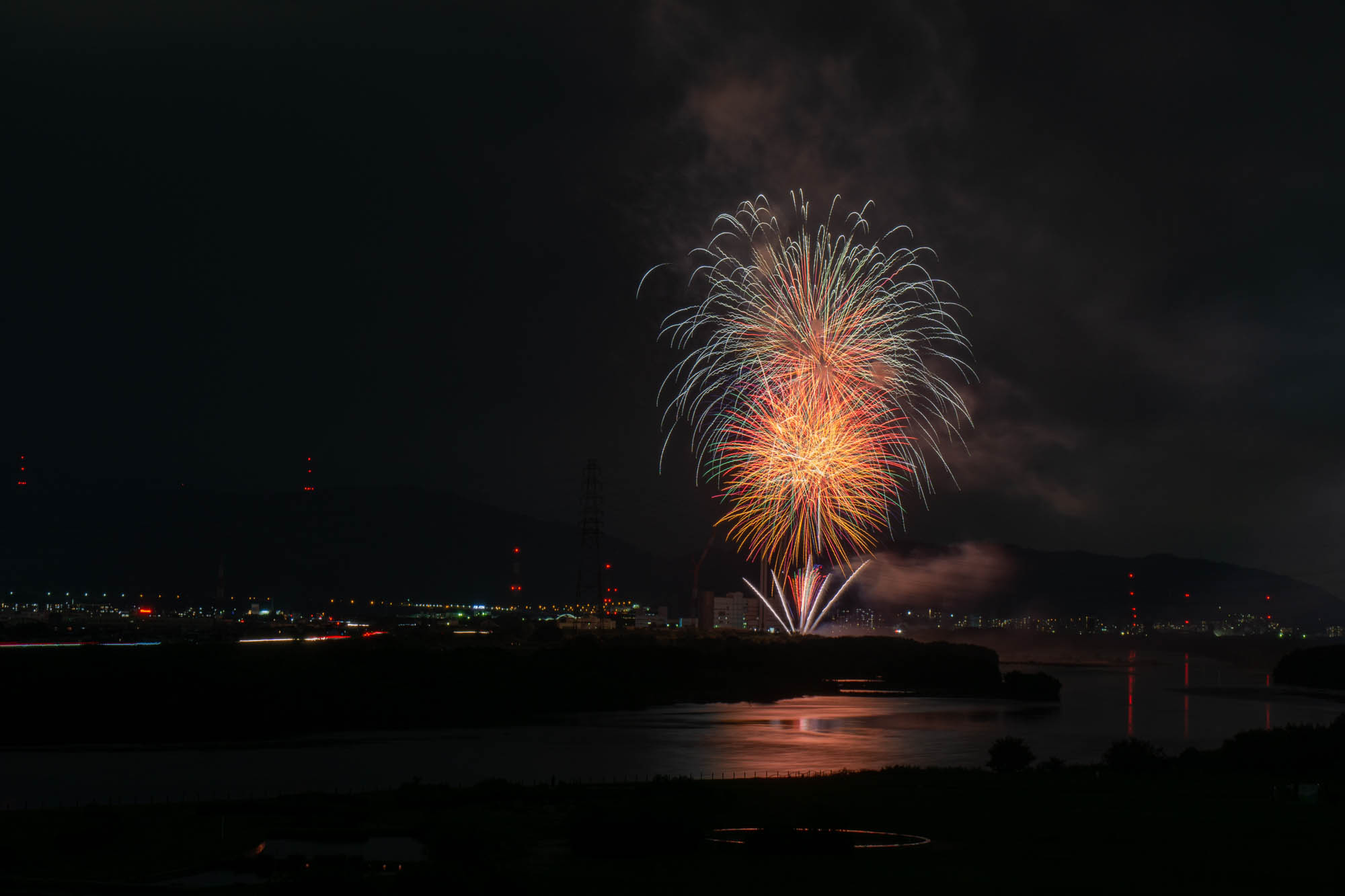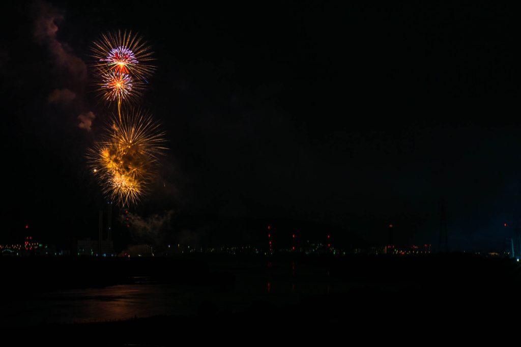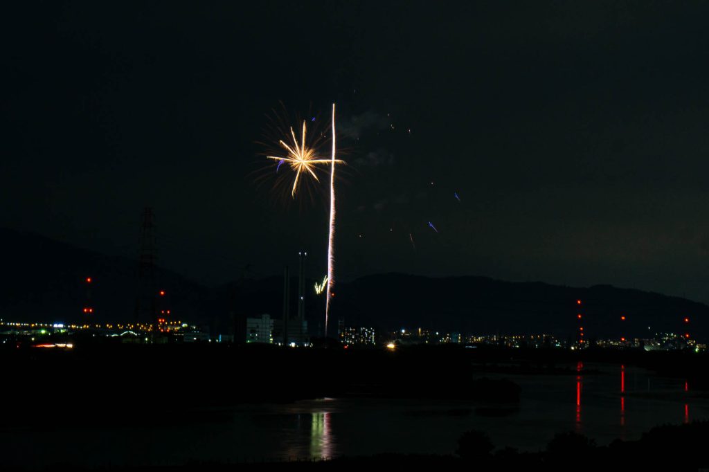 もっと川の近くから撮ったら反射する花火が綺麗に撮れたかも。