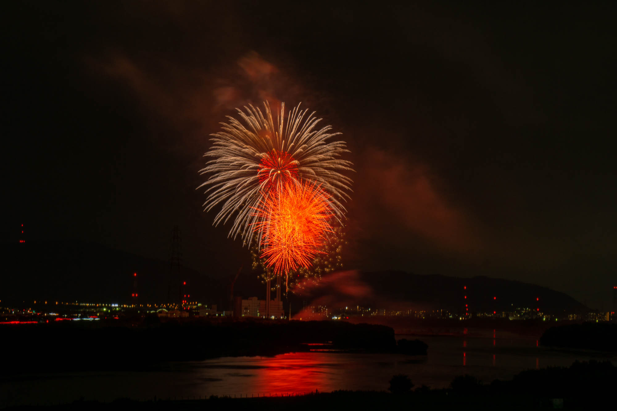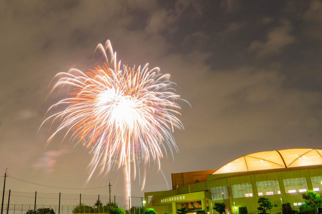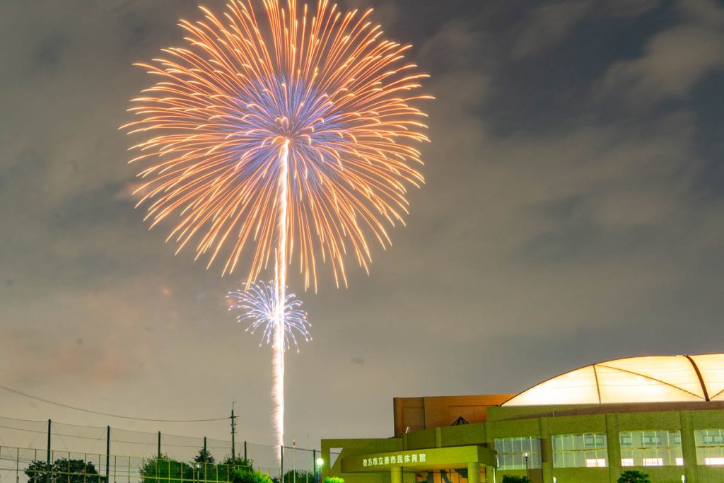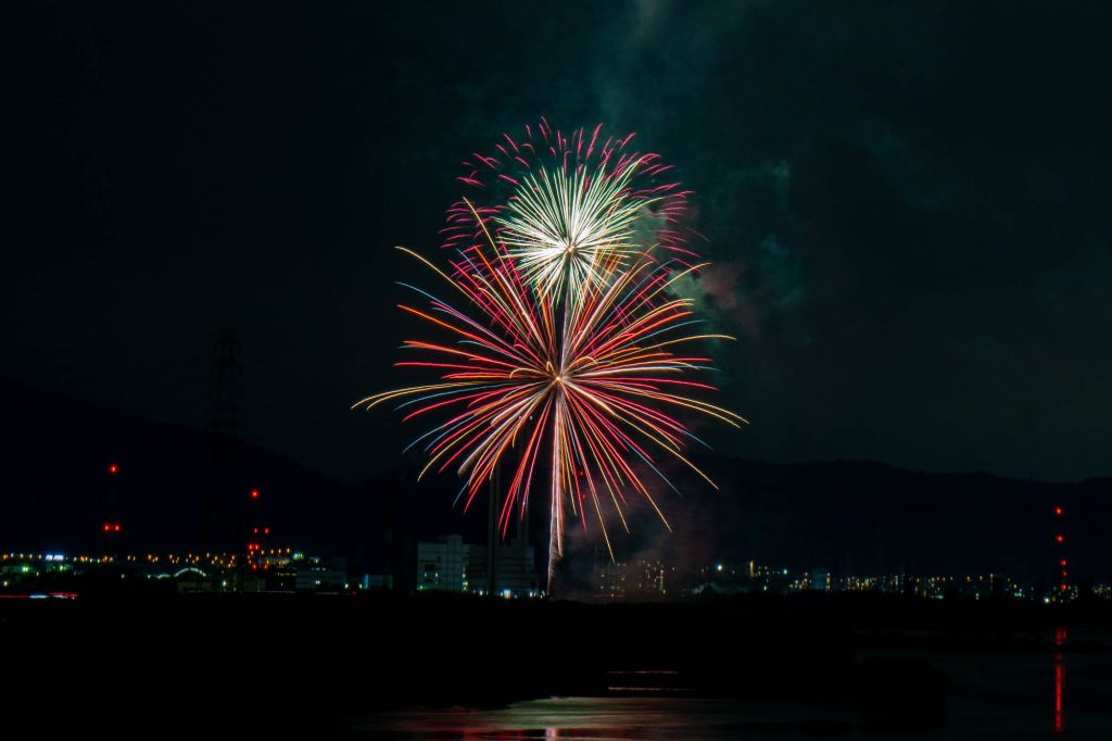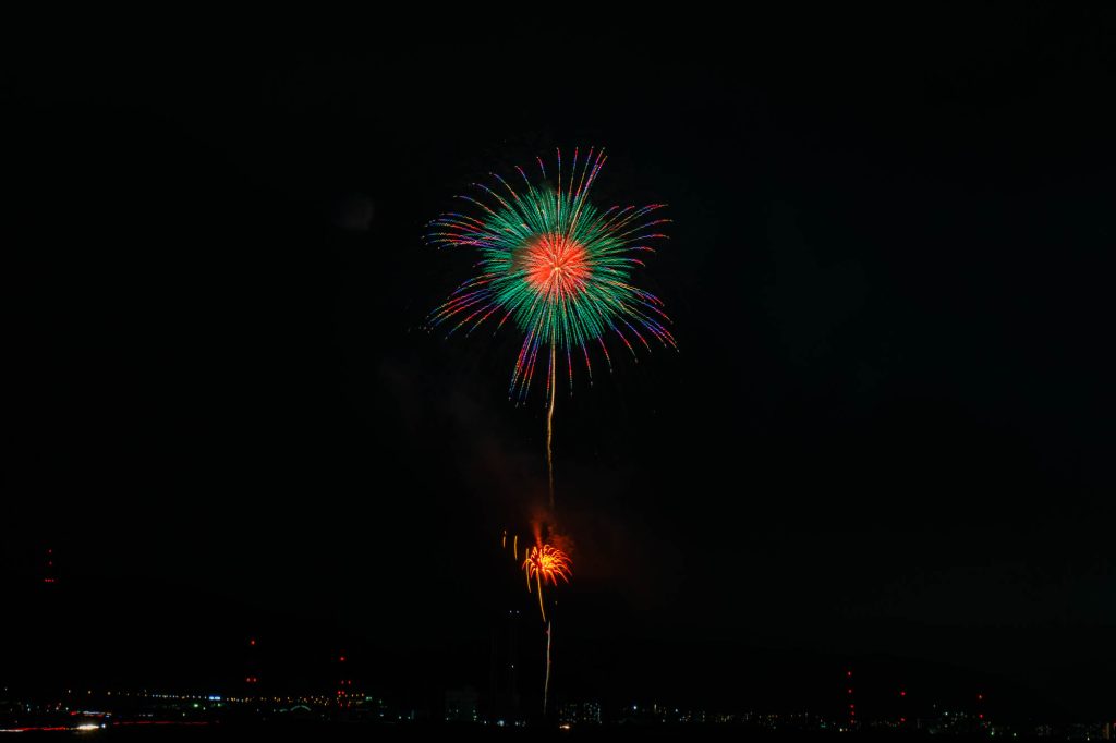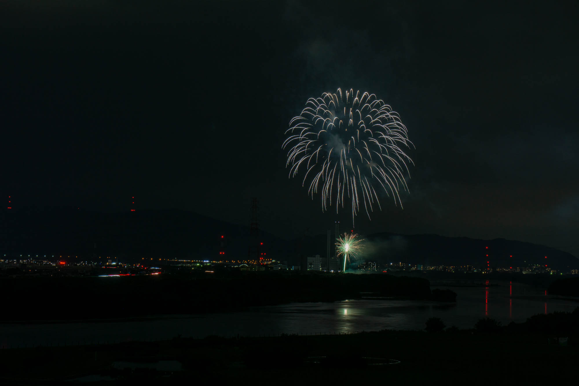 もっと川の近くから撮ったら反射する花火が綺麗に撮れたかも。