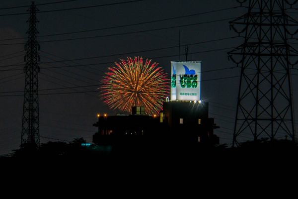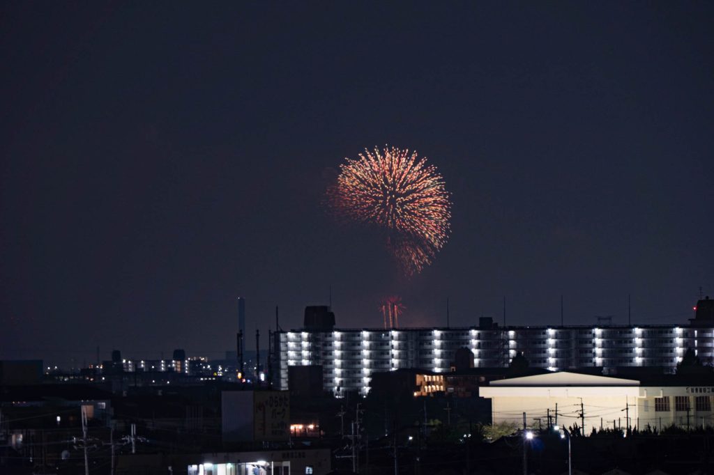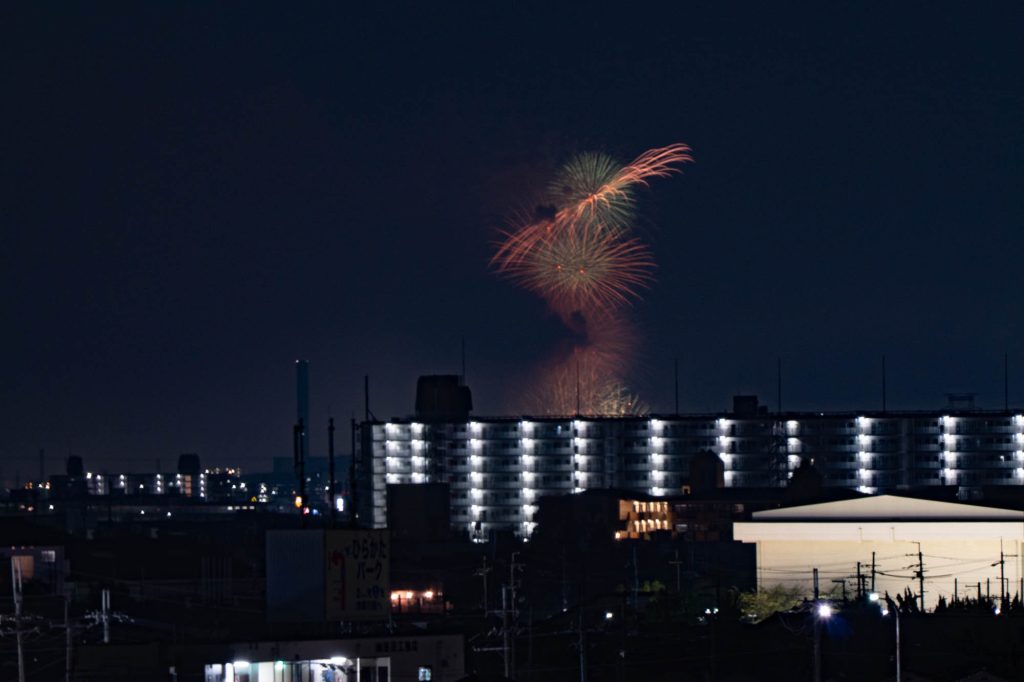 枚方公園駅近くにある鍵屋別館から「第36回 なにわ淀川花火大会」が見えています。
