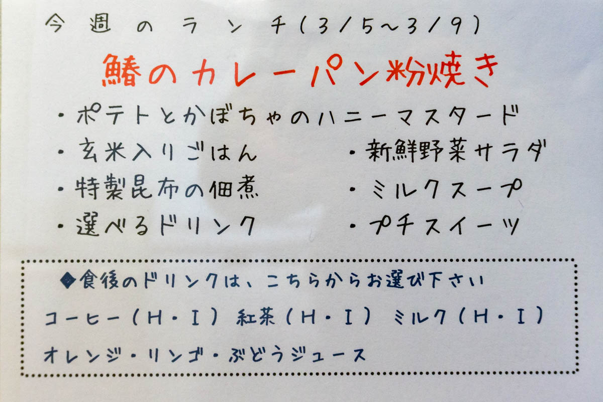 訪れる方のほとんどが注文する人気メニューの週替わりランチ。この日のメインは鰆のカレーパン粉焼き。
