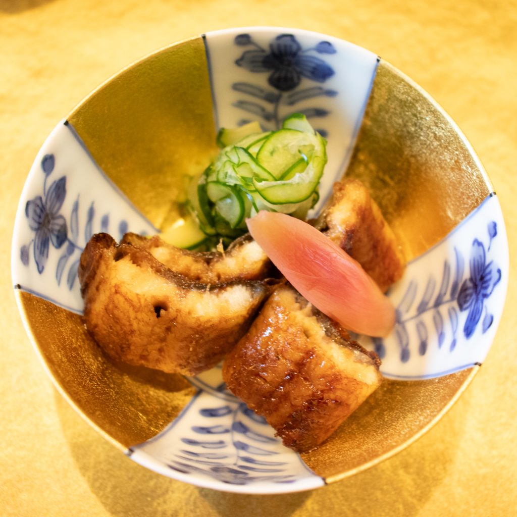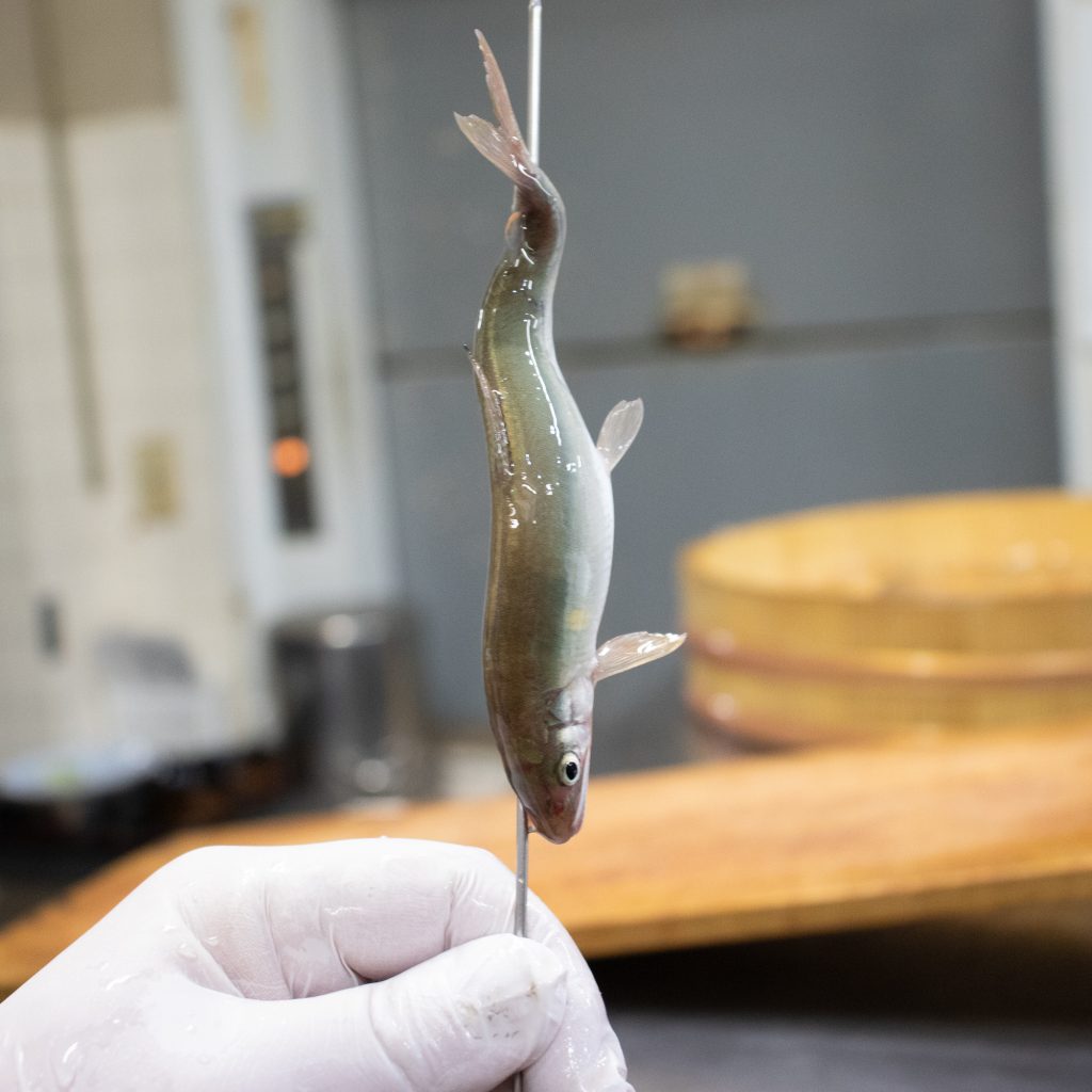 鱧は小骨が多いため骨切り(薄い皮を残して骨と身だけを切る)をすることで口当たりよく仕上げています。1ミリ程の間隔で切れ目を入れていく姿はまさに職人技。