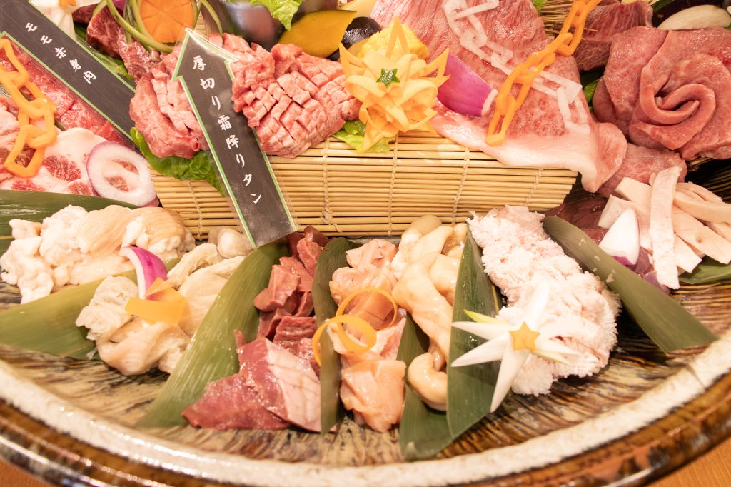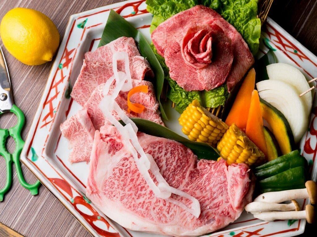 艶やかな霜降り肉にバラのように巻かれたタン、色鮮やかな野菜たちが整列。これはもう焼肉というより肉のパレード。
