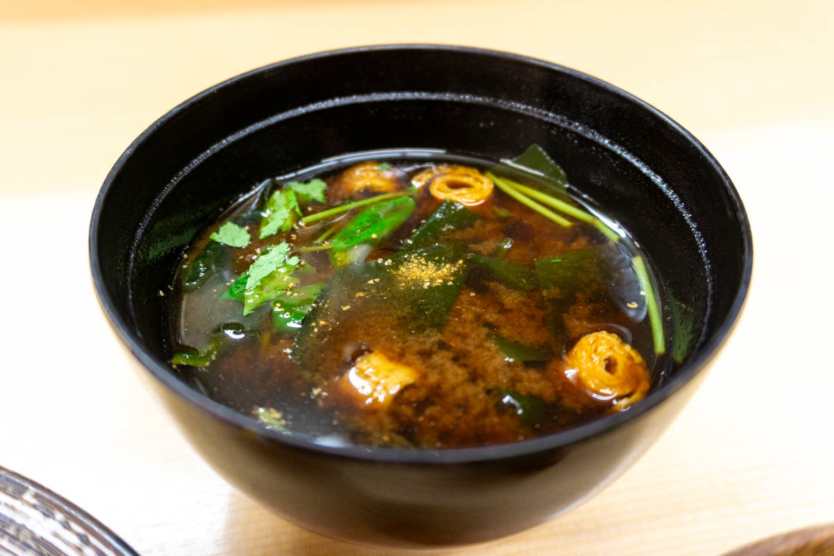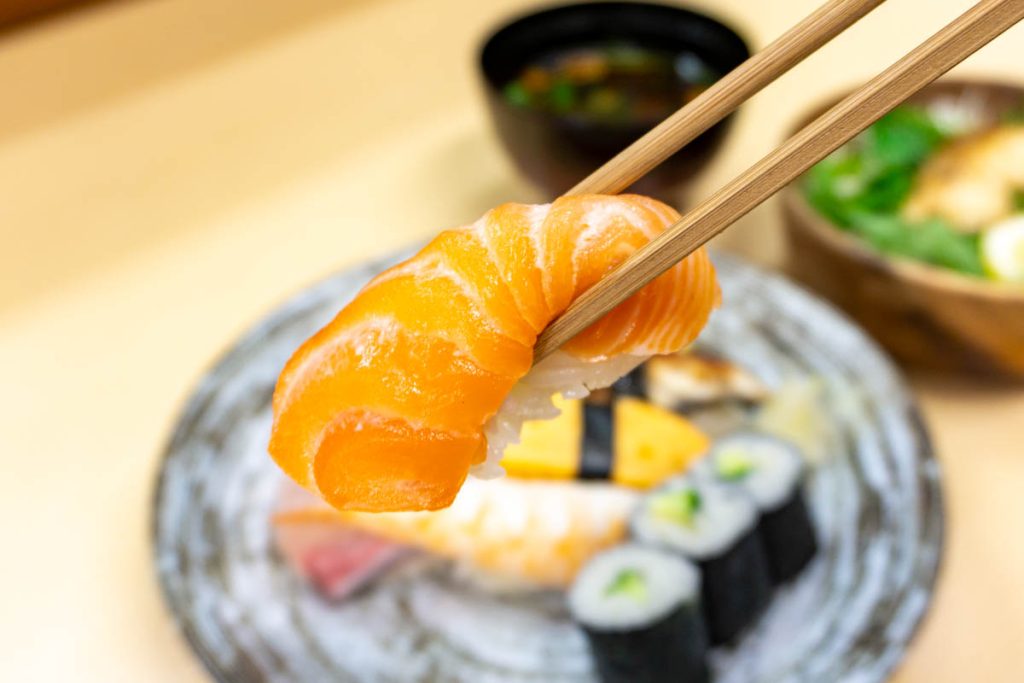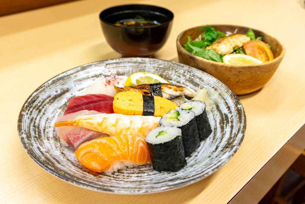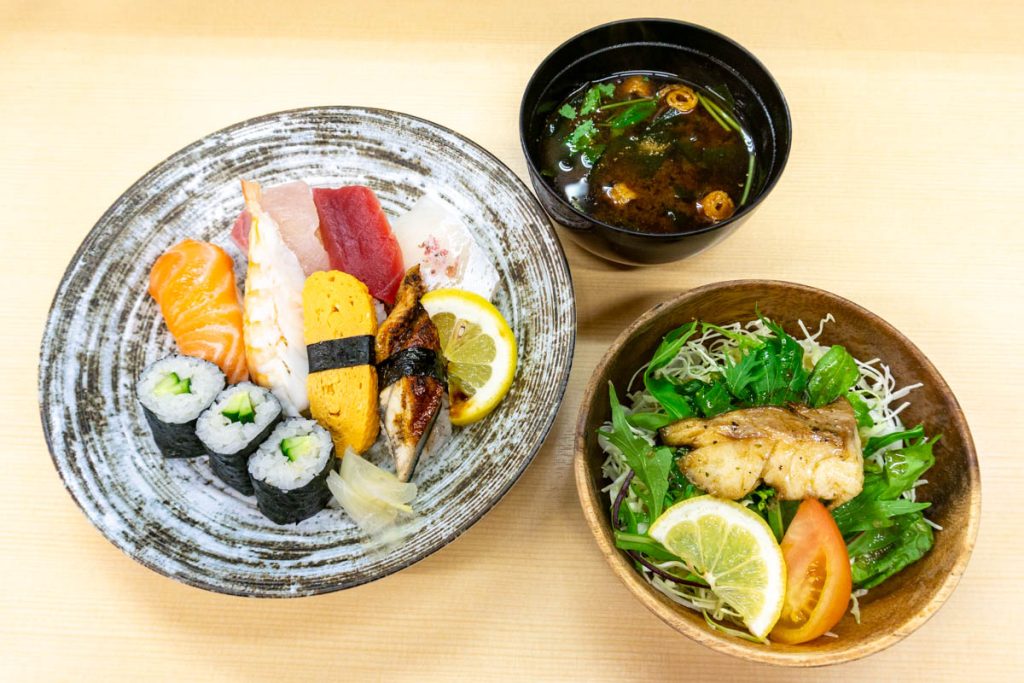 こちらは平日のみのサービスランチで、お寿司盛り合わせ・焼き魚がのったサラダ・赤だしがセットです。