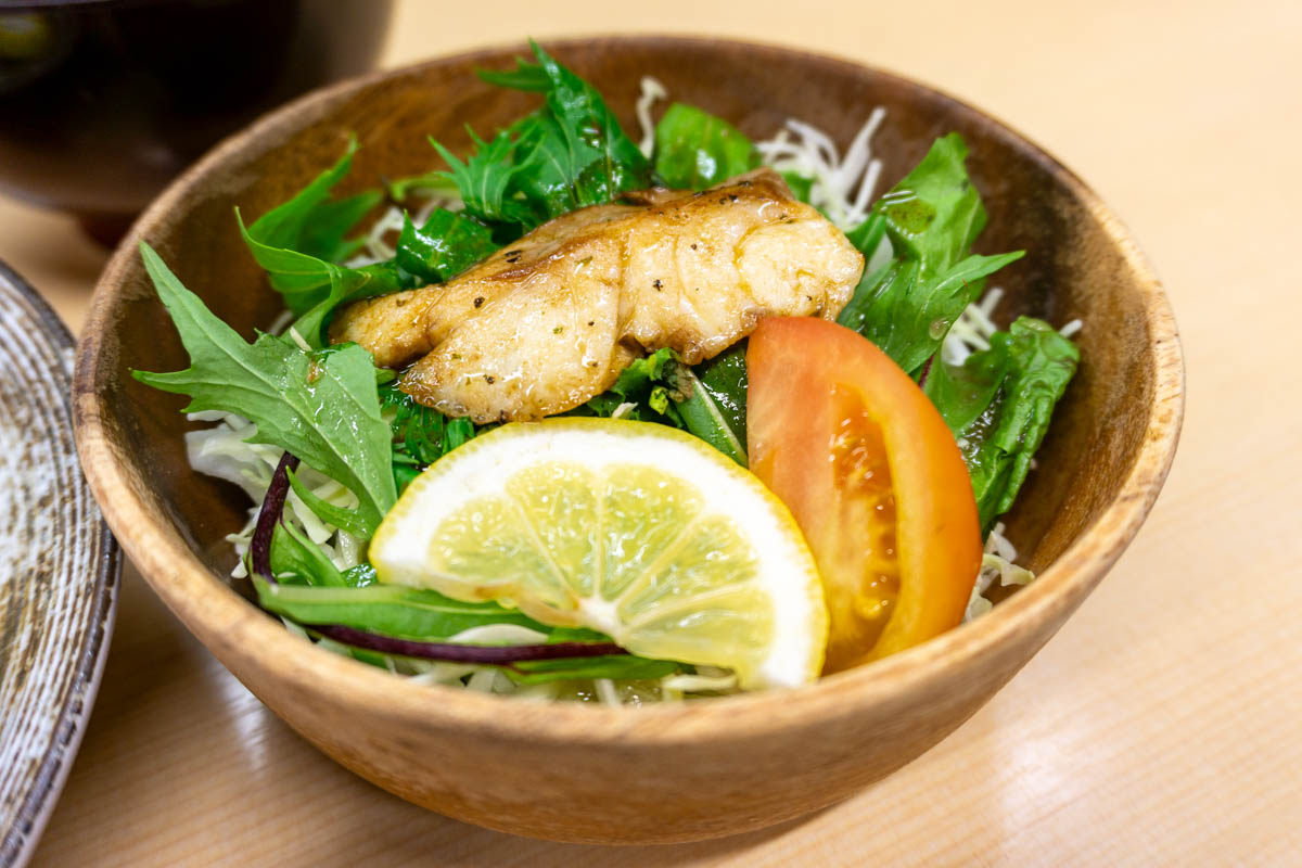 サラダはたっぷりの新鮮なお野菜に焼き魚がのっていて大ボリューム!赤だし付きで、大満足なランチセットです。