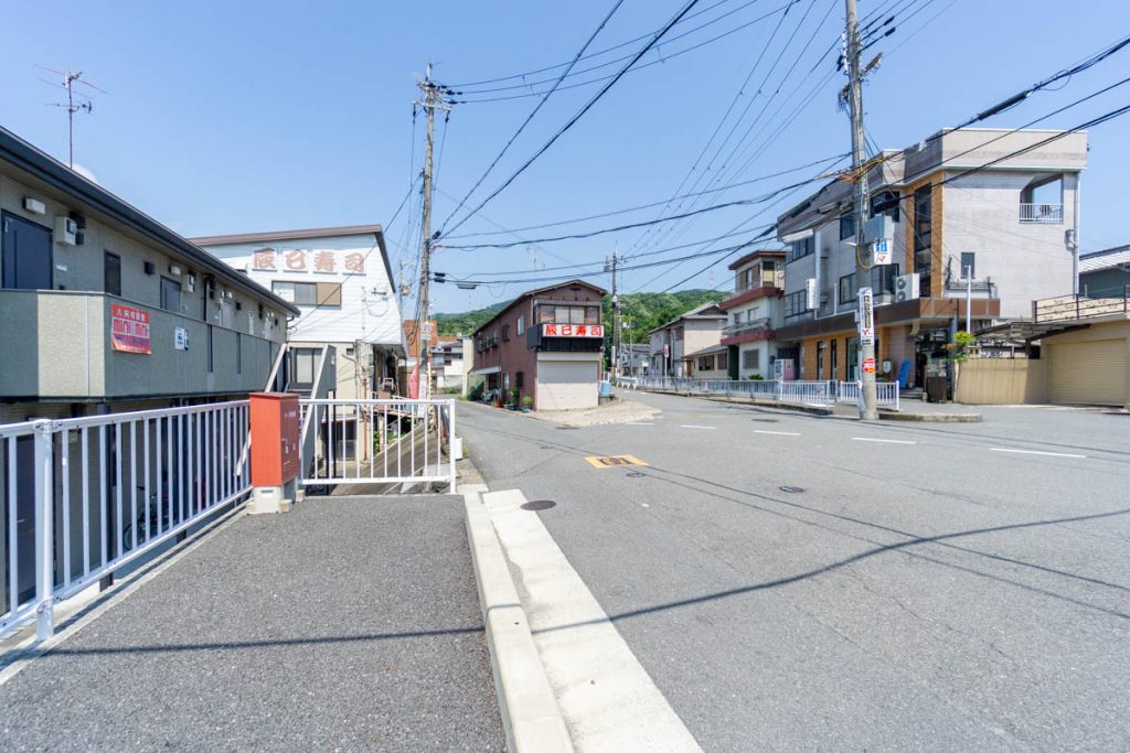 反対方向に行くとJA北河内などがあり、その先は住宅街、その向こうには交野山が。