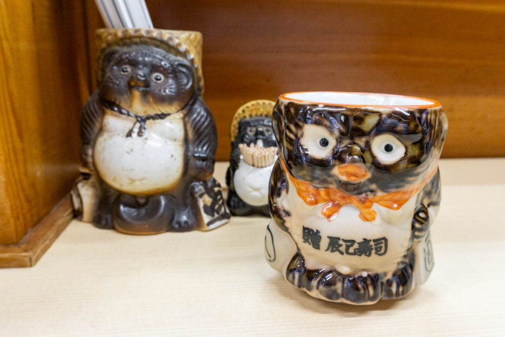 席では、愛嬌のあるたぬきの入れ物や湯呑みがお出迎え。