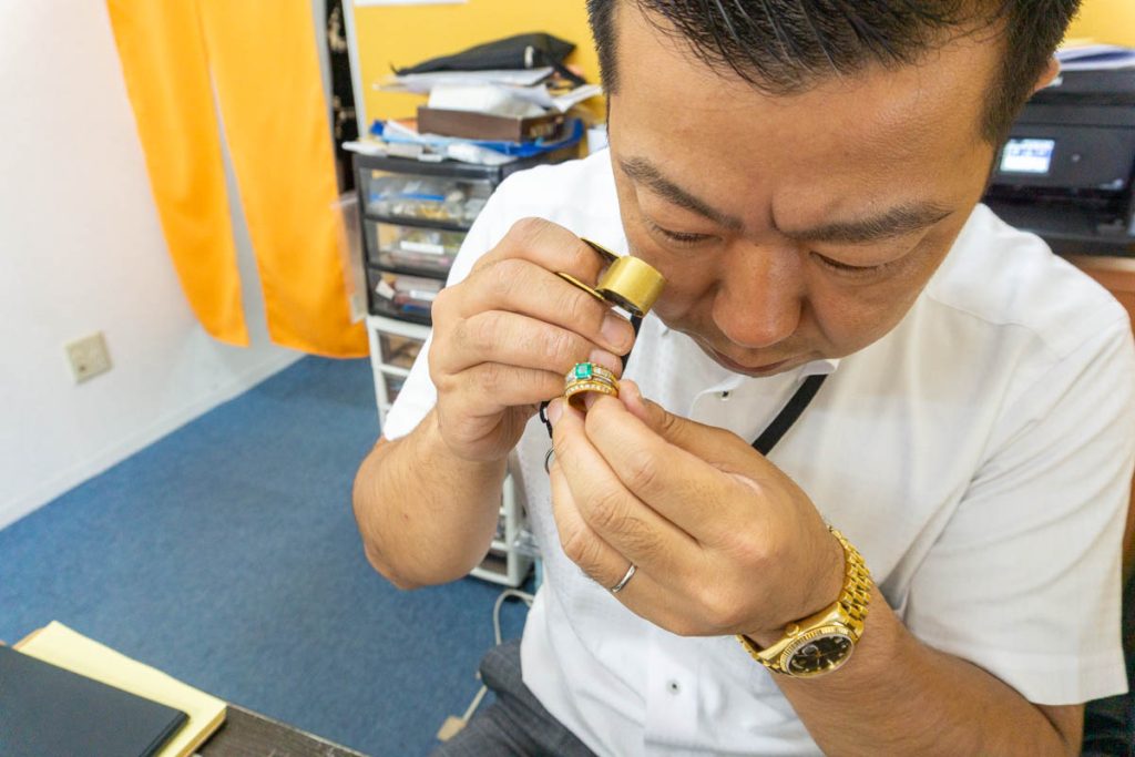貴金属の場合はルーペで見たり重さを量ったりして、宝石の種類・土台の素材などをしっかり見て査定しています。