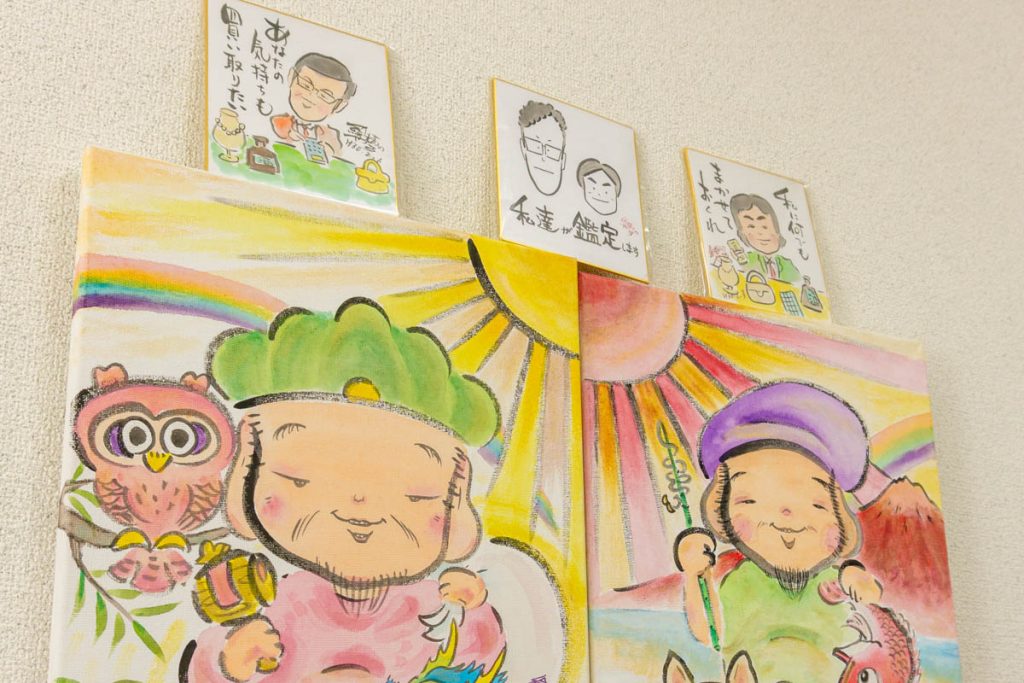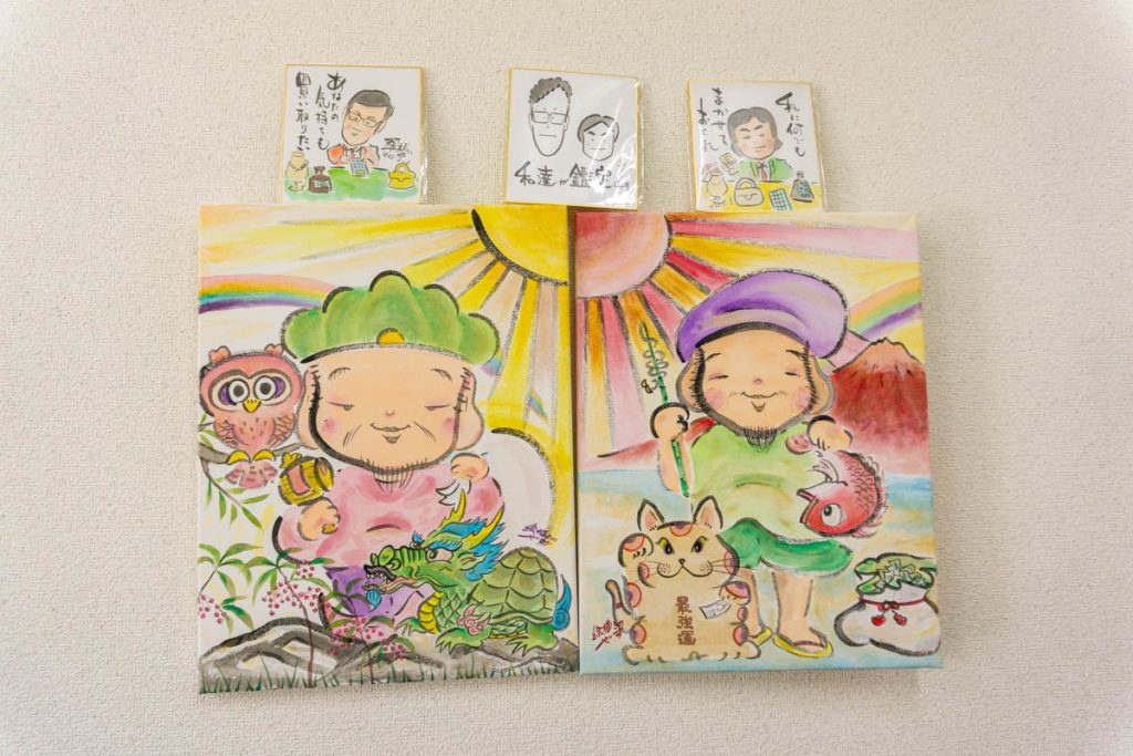 絵描きのやすさんの作品で、上の3枚はお店のスタッフさんを描いてもらったものなんだそう。