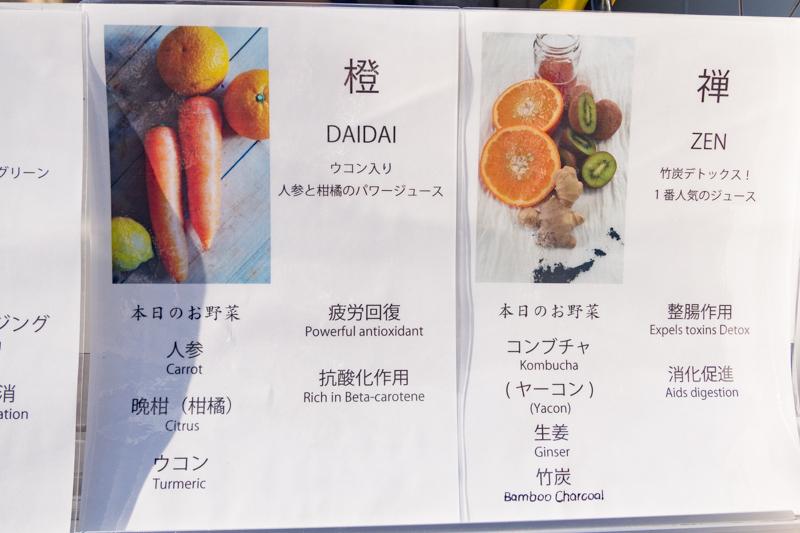 こちらは国産・無農薬の野菜と果物だけを使った「和のコールドプレスジュース」。コールドプレスジュース、ちょっと気になっていたけど飲んだことがなかったくら。