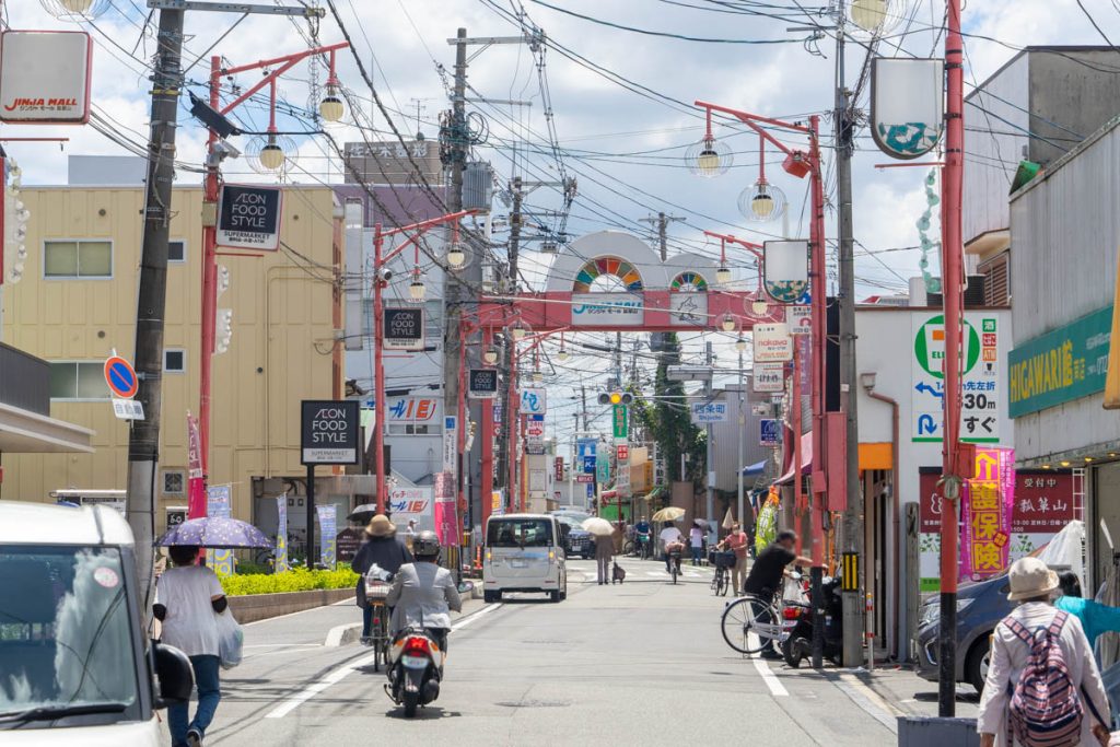 囲まれてると書いたとおり、瓢箪山駅の先にはまた商店街がありまして、名前はJINJA MALL。KUZUHA MALLみたいなノリ。
