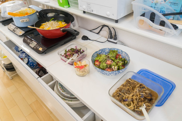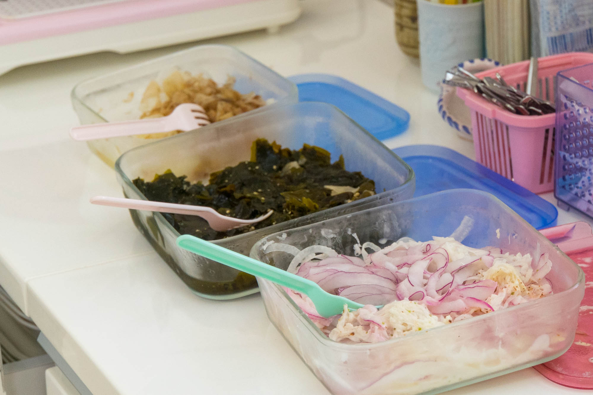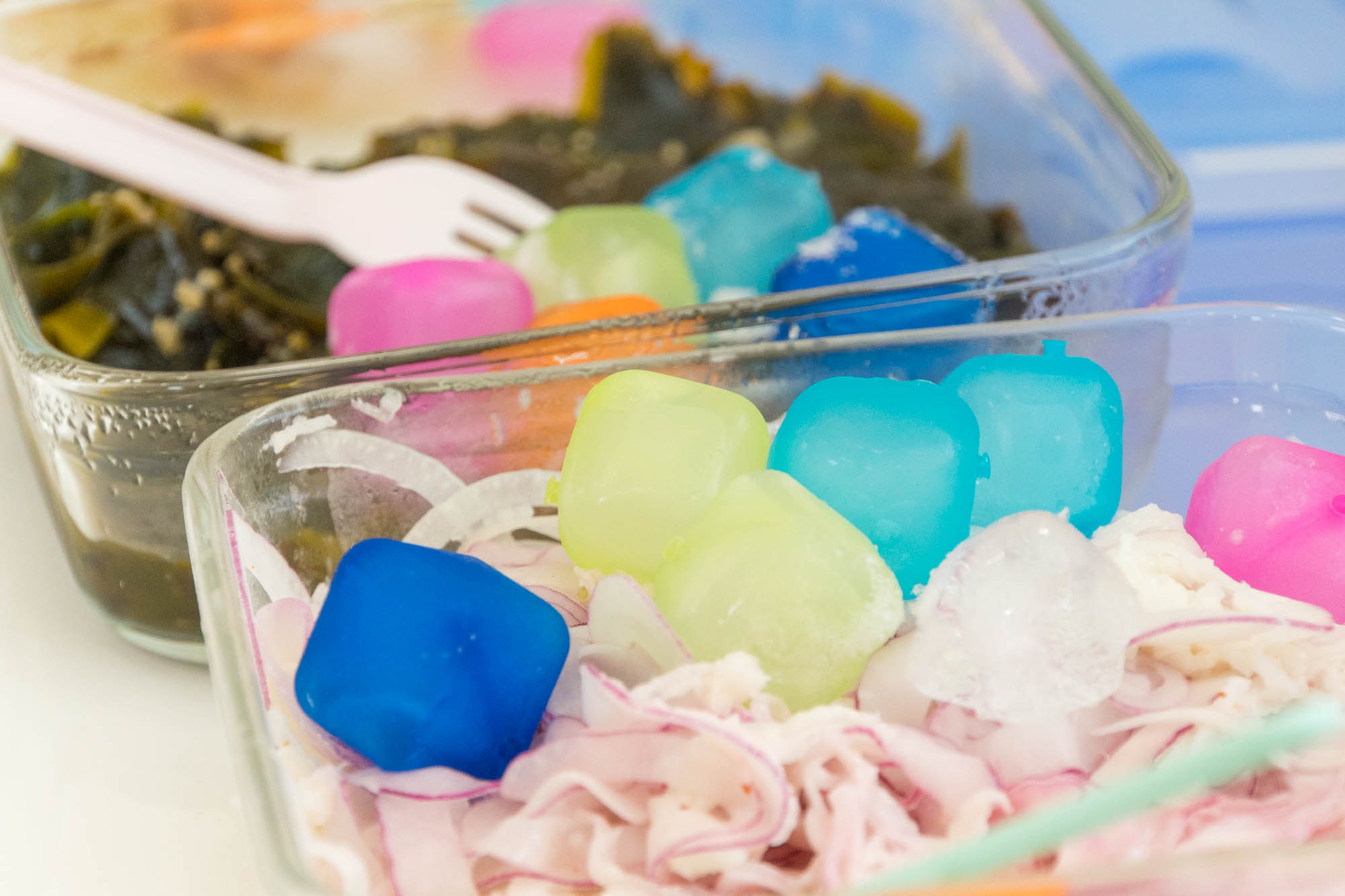 また、お惣菜は途中から温度がぬるくなってしまうので、このように周りは溶けないカラフルな氷を使ってお惣菜を冷やしたりしているんだとか。