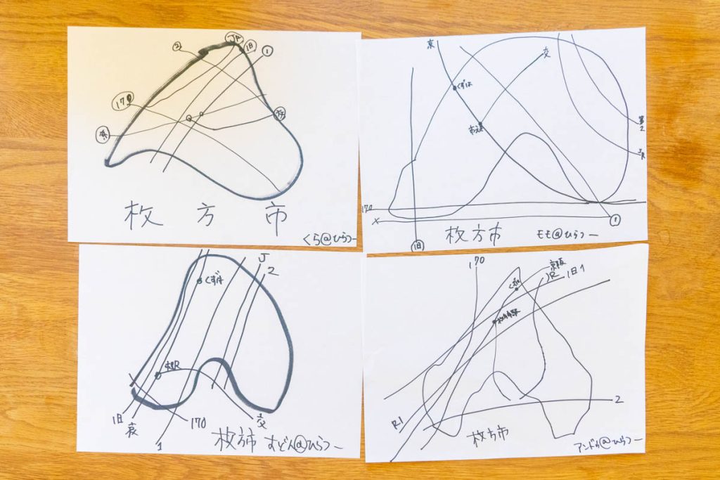 ……そこでみなさん、ひらつーで働いているねんから、枚方の地理なんて知ってて当然、という幻想をぶち壊してやろうと思いまして、ひらつーのみんなに枚方の地図を描いてもらうことにしました。