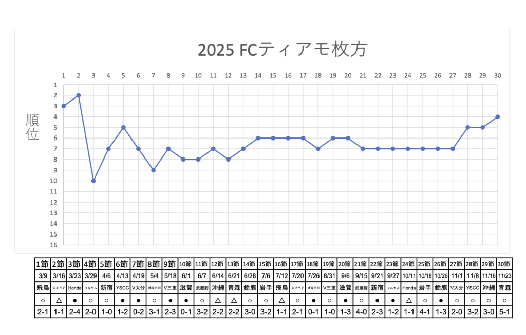 昨年2024年と勝点は同じながら、順位は4位となりました。