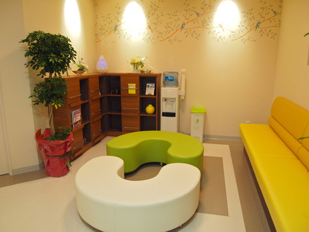 変わった形の色鮮やかなソファーがある待合室。お水もありますね。