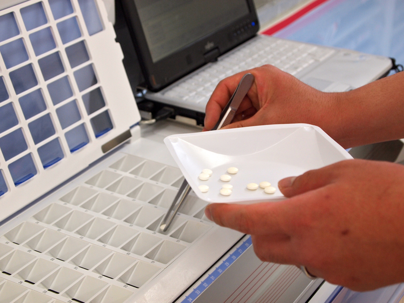 ピンセットで薬を分けていき、フタを閉め、データ入力などをしてボタンを押すと・・・